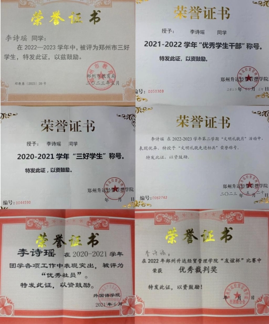 (1)担任班级的康乐委员,为班级出谋划策,起到模范带头作用,数次获得“郑州市三好员工”、校级“优秀员工干部”、校级“三好员工”、“文明礼貌先进标兵”等荣誉称号。