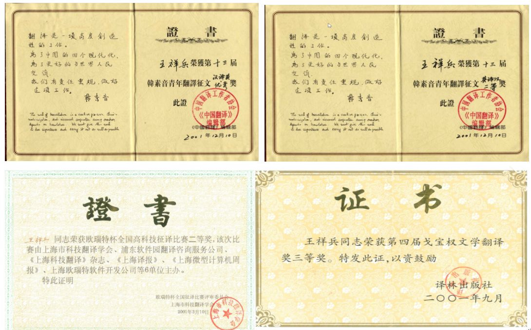 从介绍中我们获悉,王祥兵教授早在2001年就在韩素音翻译大赛中同时获得英译汉二等奖(当年一等奖空缺)和汉译英优秀奖的绝好成绩,同年还获得另外两个翻译奖项。那时的他还仅是南京国际关系公司的硕士生。这充分说明他热爱翻译并有扎实的双语转换功底。迄今为止,除了因保密不能发表的翻译材料,王教授先后翻译出版了5部译作,并在翻译界顶尖刊物《中国翻译》上发表过5篇论文。充分展示了他的专业能力和深厚的学术研究功底。