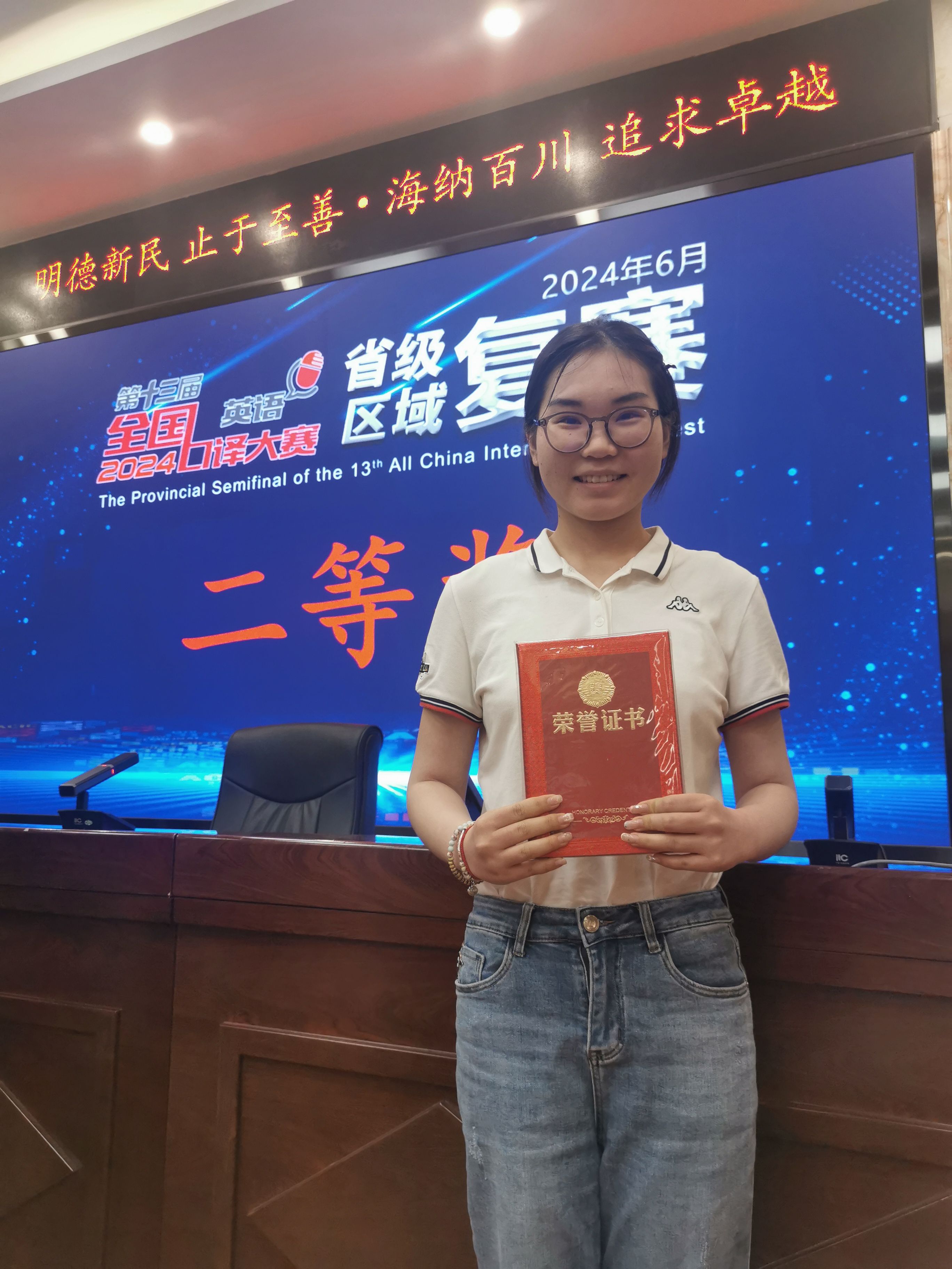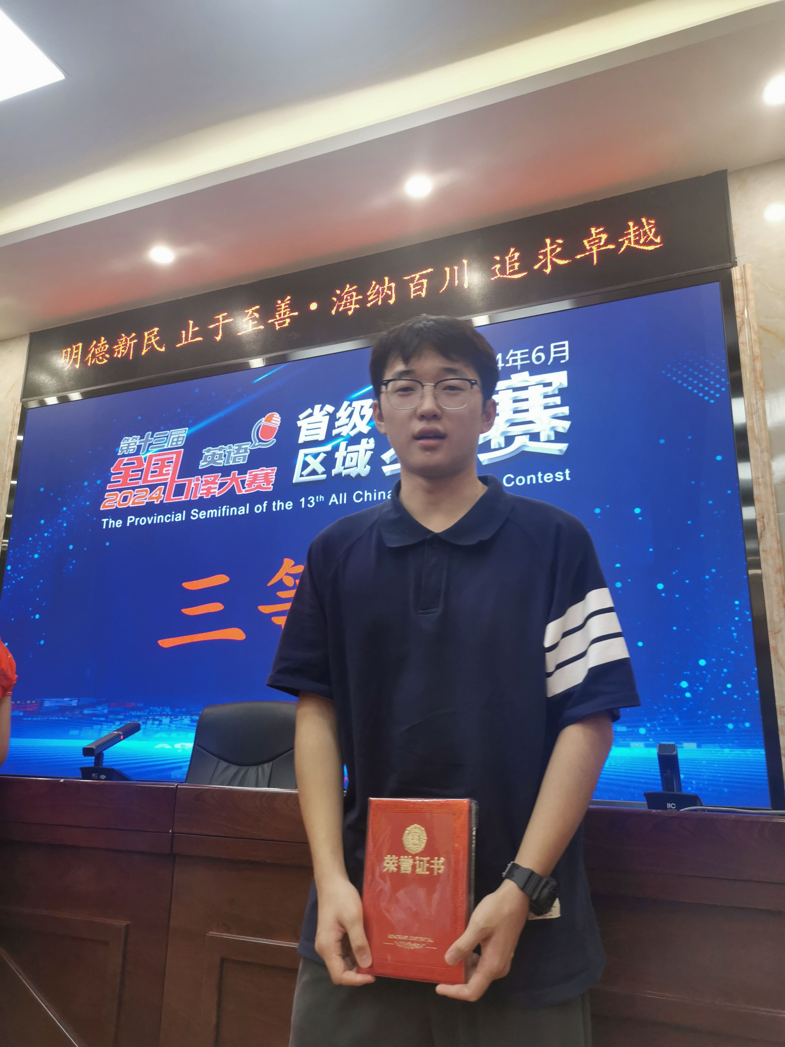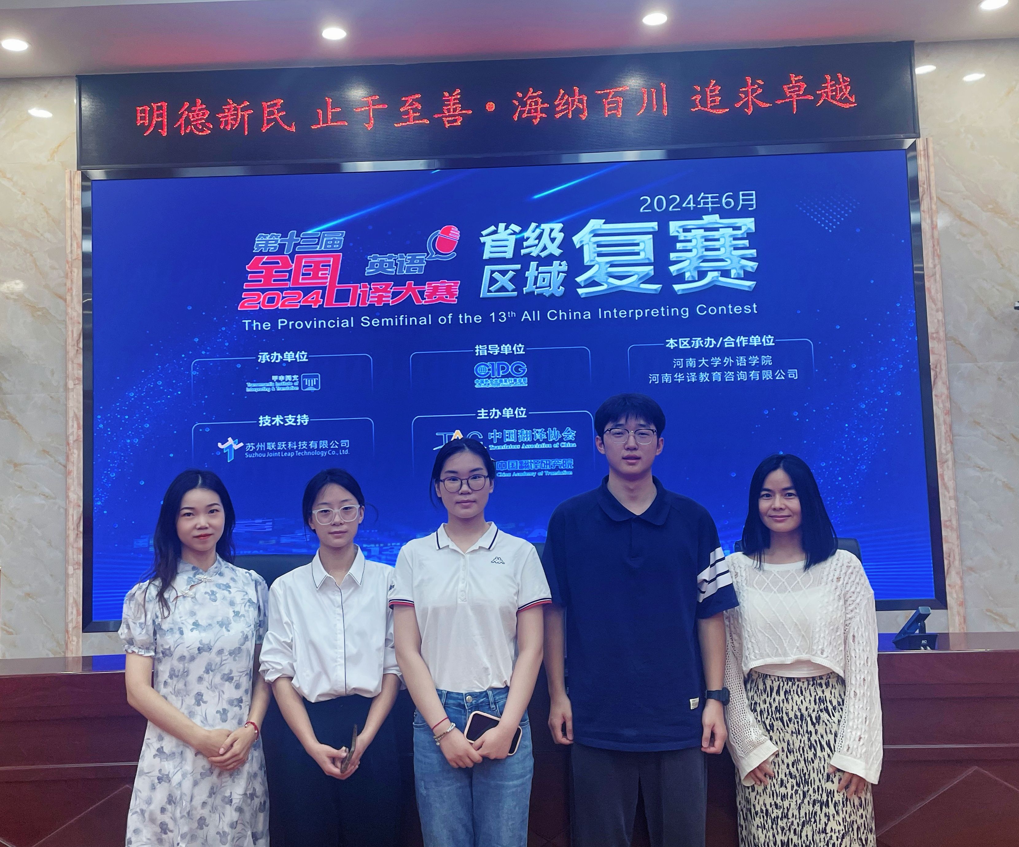 2024年6月22日,第十三届全国口译大赛河南省复赛在河南大学明伦校区举行,来自省内高校的近百名优秀选手参加了本次比赛,竞争异常激烈。由beats365唯一官方网站翻译教研室孙燕冉、李笑寒、王余成三位老师指导的2021级翻译1班王嘉啟同学、赵倍弘同学和2021级翻译2班的兰琪萱同学经过上午场的比赛,顺利晋级到下午场的角逐。凭借扎实的专业素养和出色的现场表现,兰琪萱和赵倍弘同学荣获二等奖,王嘉啟同学荣获三等奖,为公司赢得了荣誉。