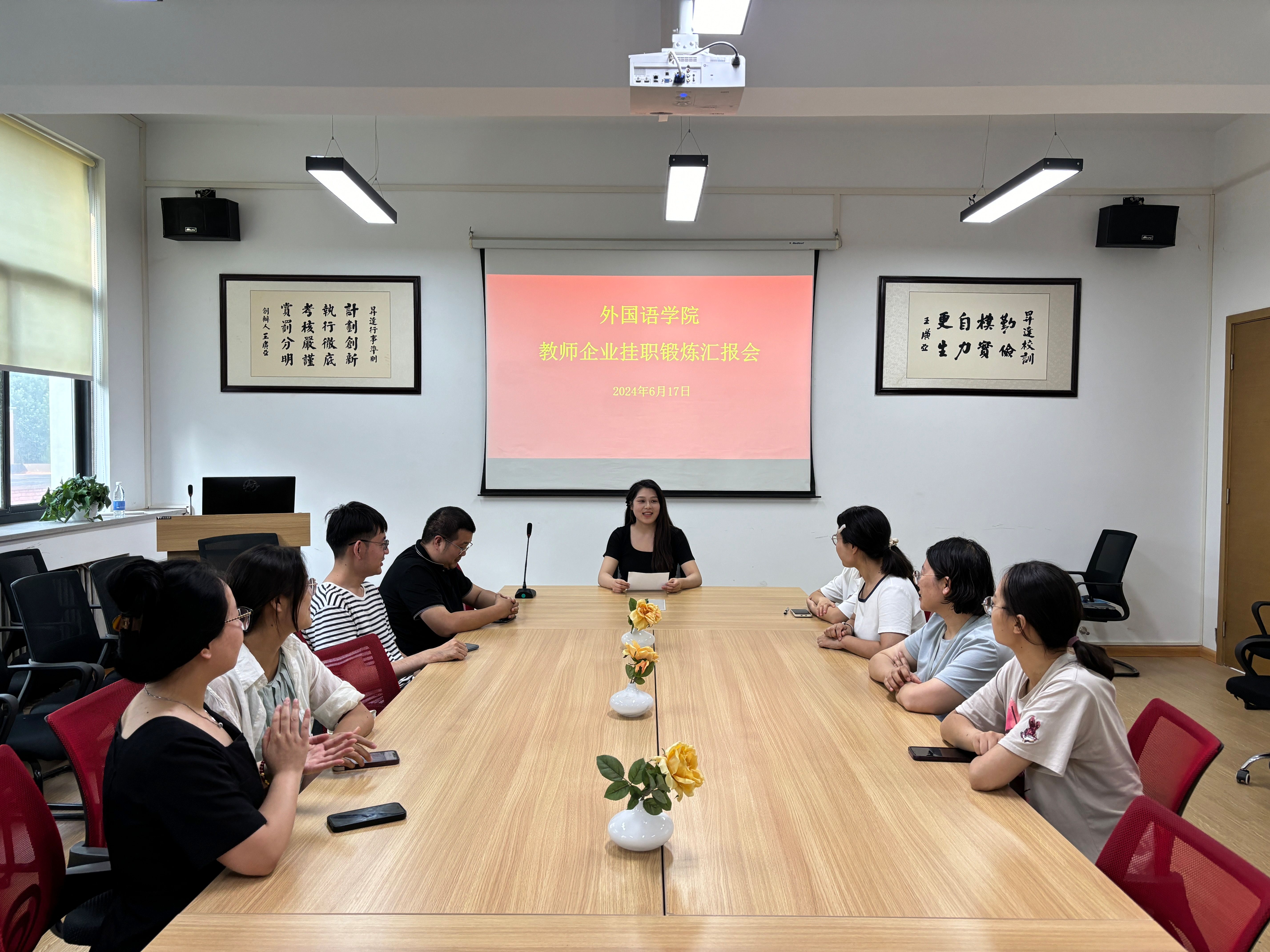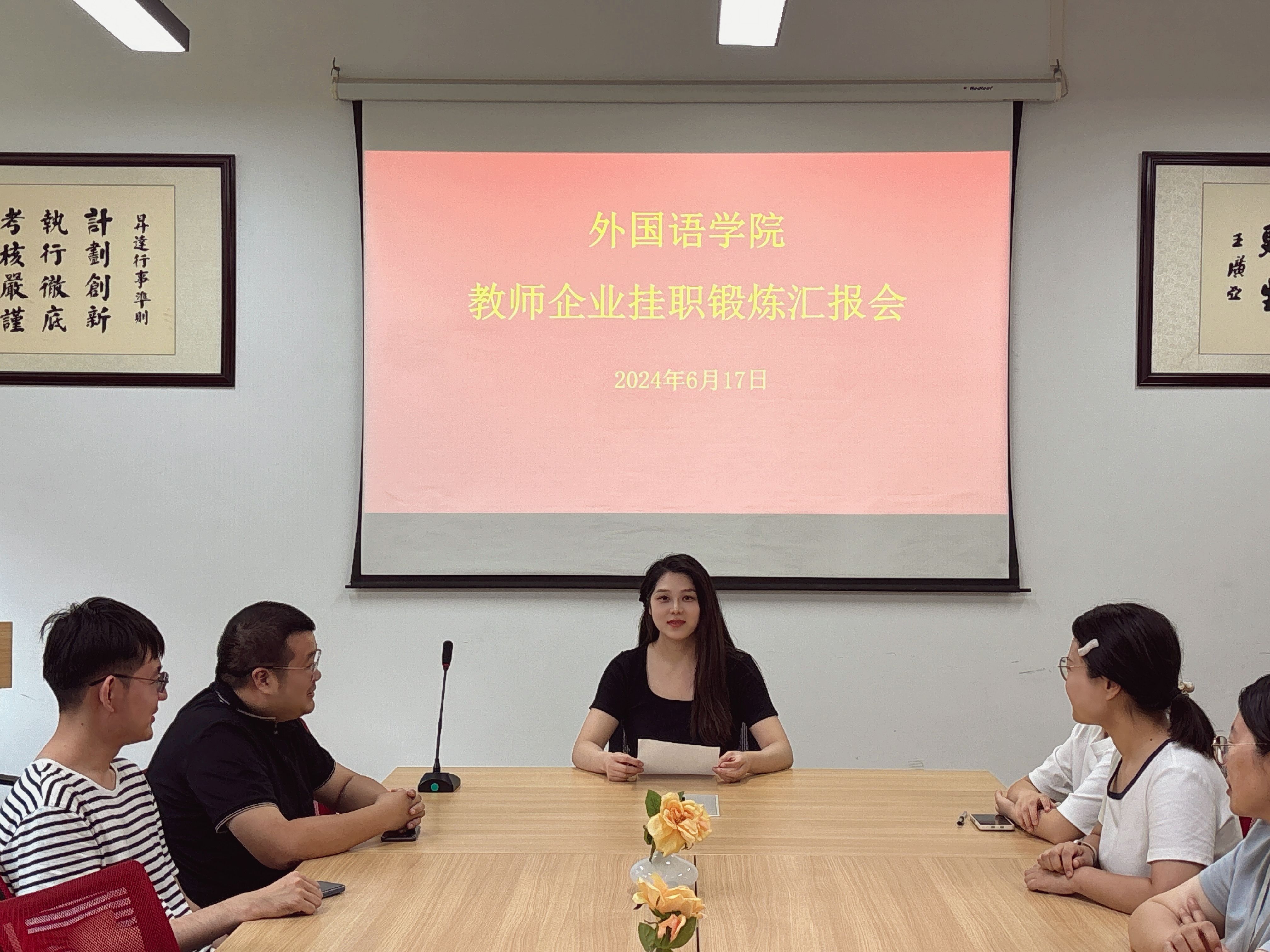 2024年6月17日,在beats365唯一官方网站会议室召开第八批教师到企业挂职锻炼汇报会,本次挂职老师为英语教研室周凯旋老师,她分享了自己在企业挂职的收获。