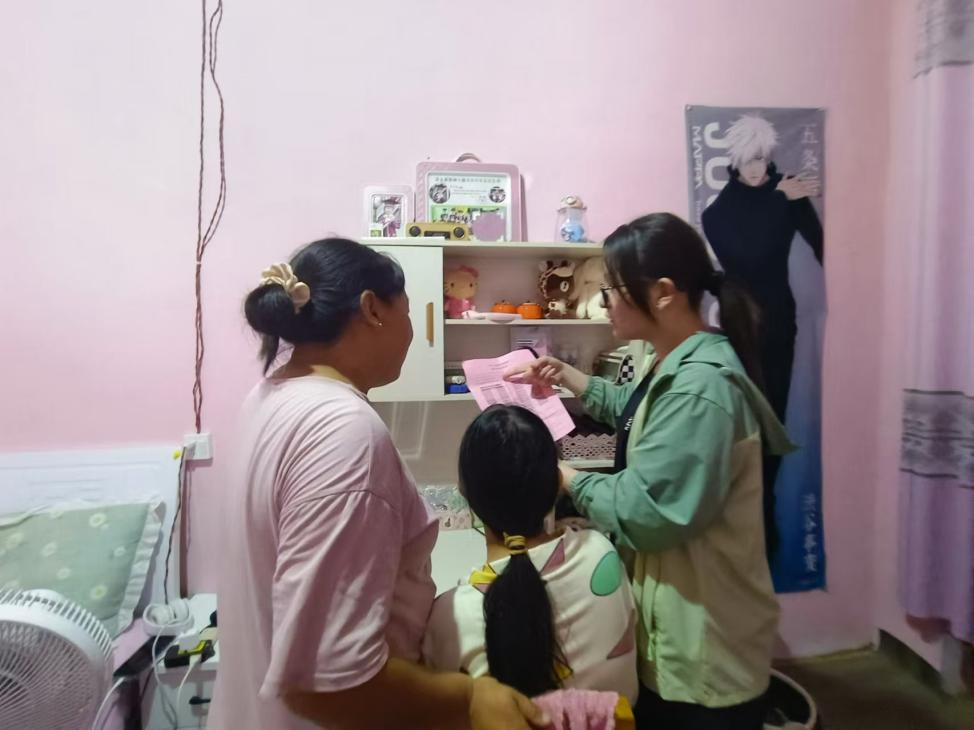 2024年7月28日,在河南省安阳书内黄县,我走访宣传的是一户受灾家庭,靠务农生存,家里女儿在校就读中学三年级。聊天中就感觉女生性格内向,之后与家长的不断聊天中向我问出了他们埋藏心底的问题——今年家里收成差,负债很多,孩子的学费负担很大。我为她和家长讲解了国家资助政策、国家助学贷款和办理的方法,打消了她和家人因家庭经济困难“上不起学”的顾虑。了解到学习中数学有困难,我还为她补习了中学二年级学过的知识点,预习即将学习的九年级课程,并且制定暑期学习计划。