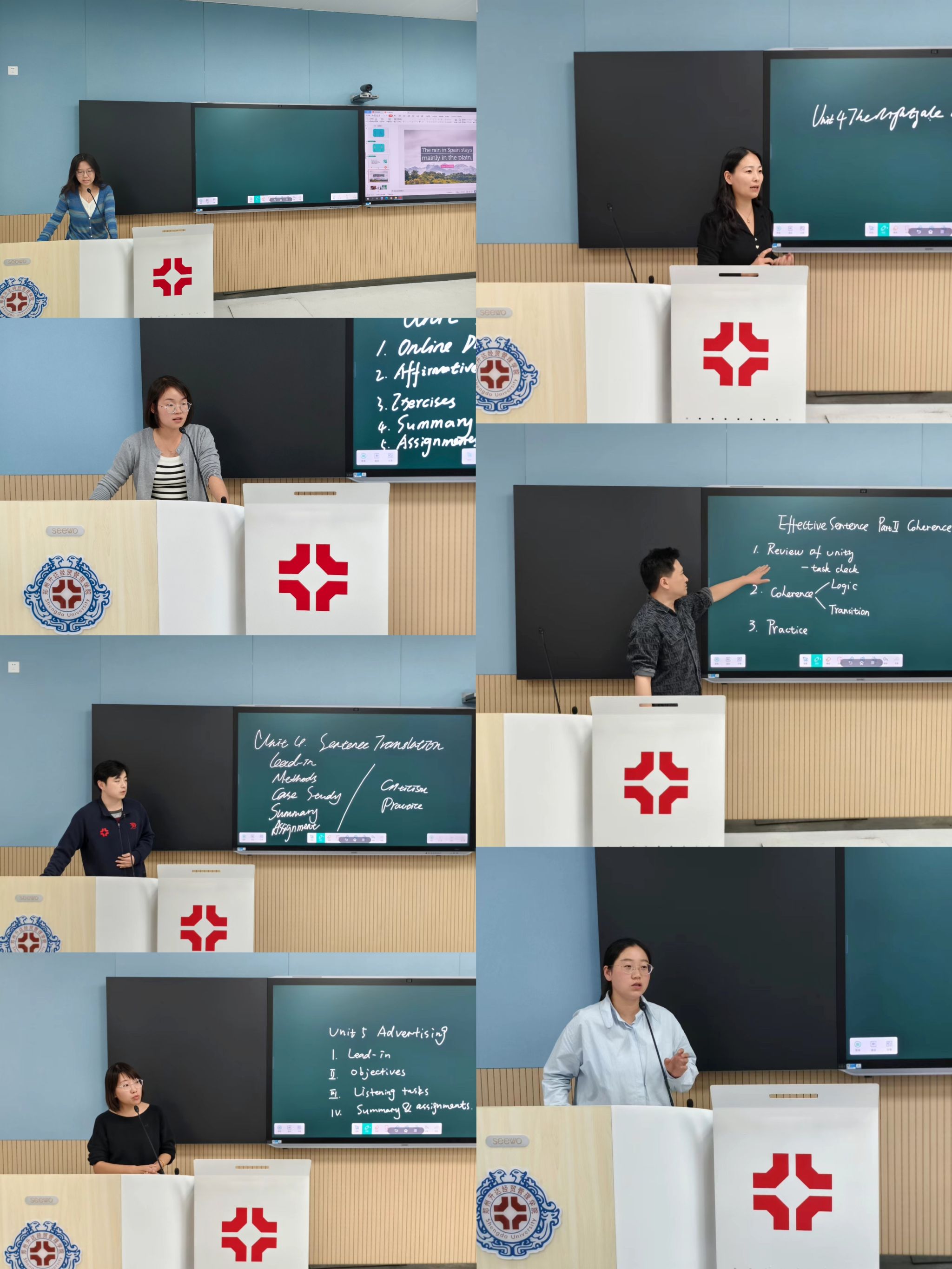 在观摩和互评环节,教师们互相学习、取长补短。现场讨论氛围热烈而融洽,教师之间的交流互动得到了进一步加强,团队凝聚力得到了显著提升。每位教师磨课结束之后,翻译教研室其他教师对该教师的教学内容、教学手段与方法、教学评价等方面提出了宝贵的建议。