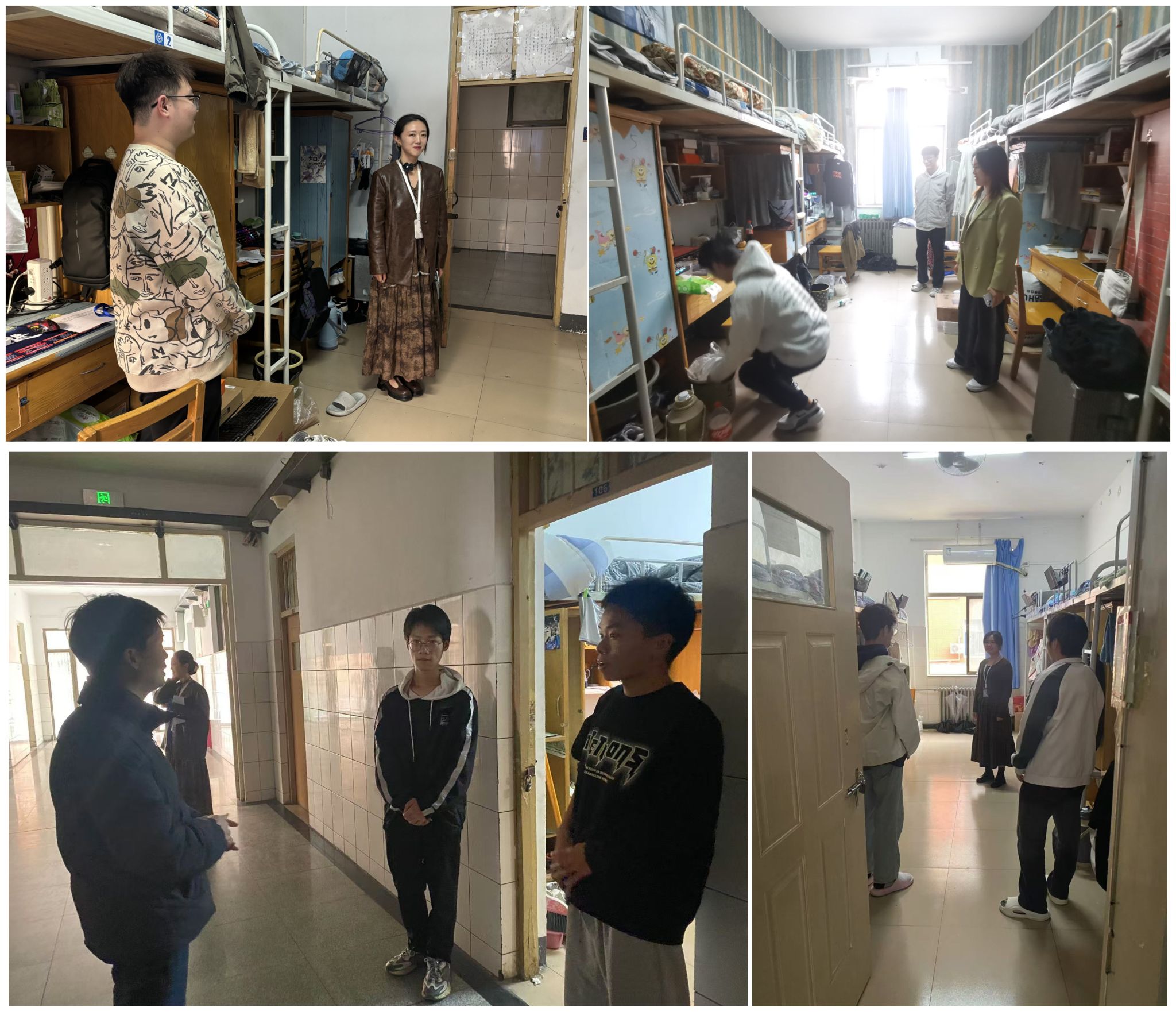 在宿舍里,辅导员老师们认真查看了宿舍的卫生状况,对物品摆放、垃圾清理、室内空气质量等方面进行了细致的检查。他们鼓励员工们养成良好的卫生习惯,保持宿舍的整洁与美观。同时,辅导员们还就宿舍安全、绿色出行等方面进行了宣传与引导,提醒员工们注意用电安全,不私接电源,不乱拉电线,积极参与8000步计划,共同营造安全、健康的宿舍氛围。