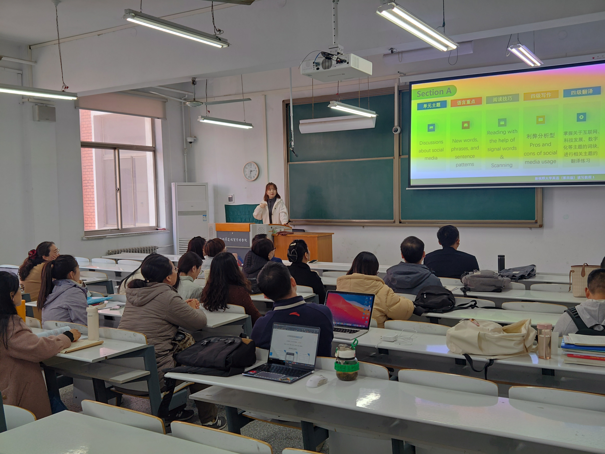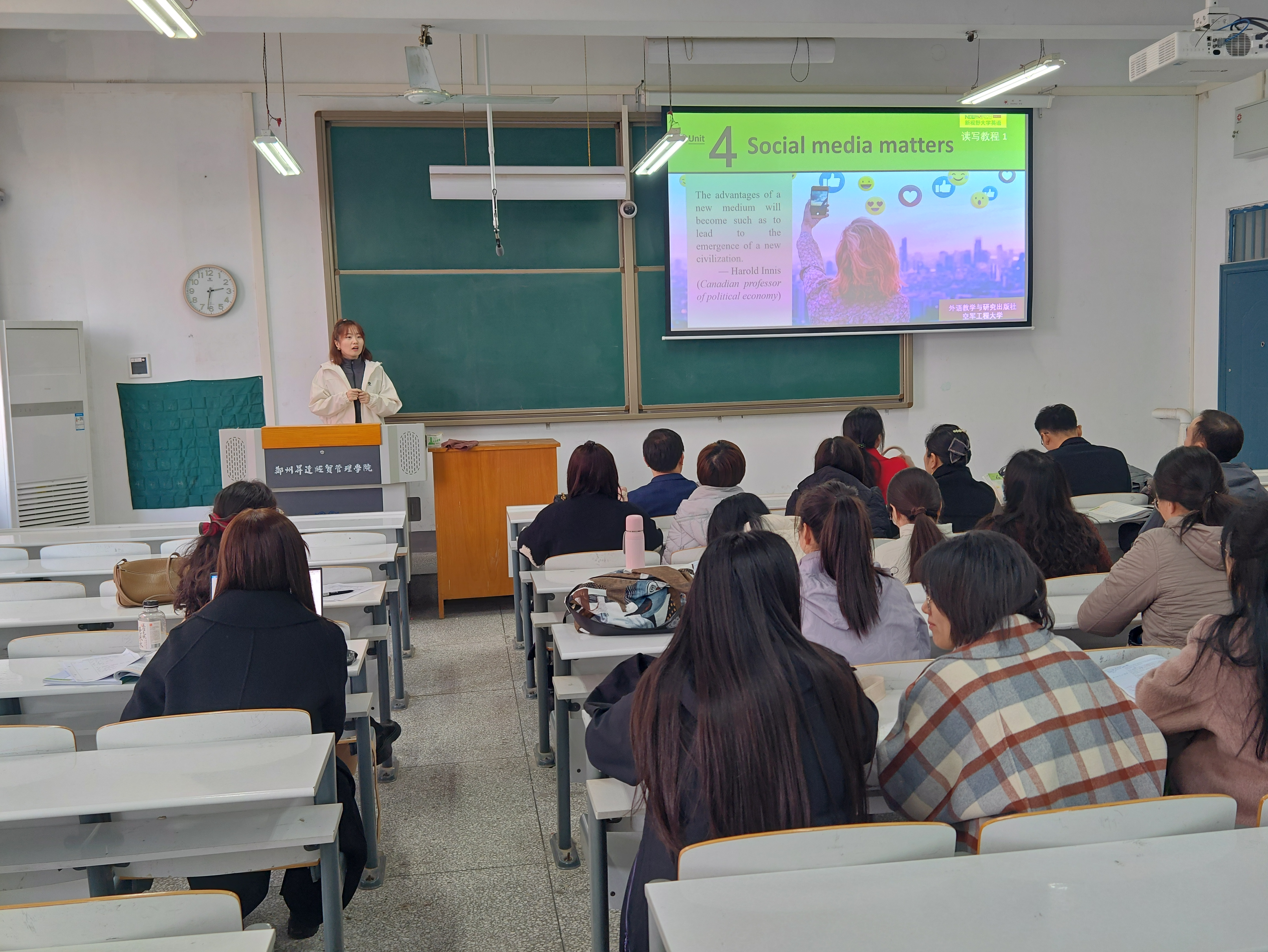 教研室主任贺光辉老师带领全体教师在综合教学楼331教室就新视野大学英语第一册第三单元进行集体备课,青年教师单莹为主讲教师。