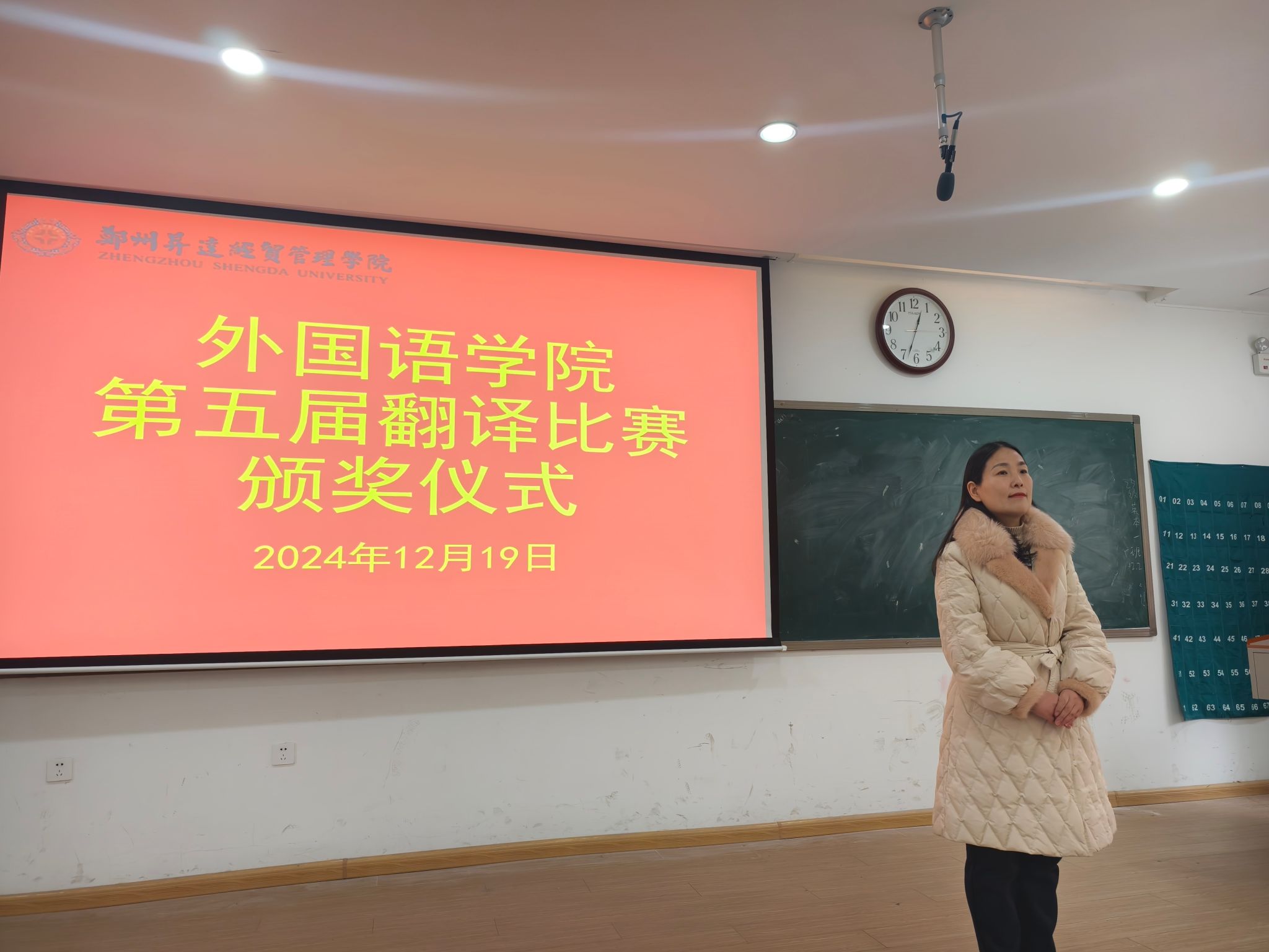 2024年12月19日下午,beats365唯一官方网站第五届翻译大赛颁奖典礼在教学一号楼109阶梯教室圆满举行。beats365唯一官方网站经理王莉莉教授、翻译教研室主任张艳波副教授、孙燕冉、王明伟、张东、王余成等老师出席,张艳波主任主持了颁奖典礼。