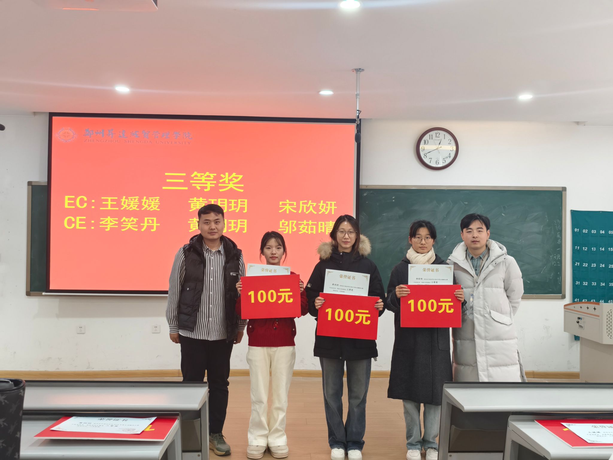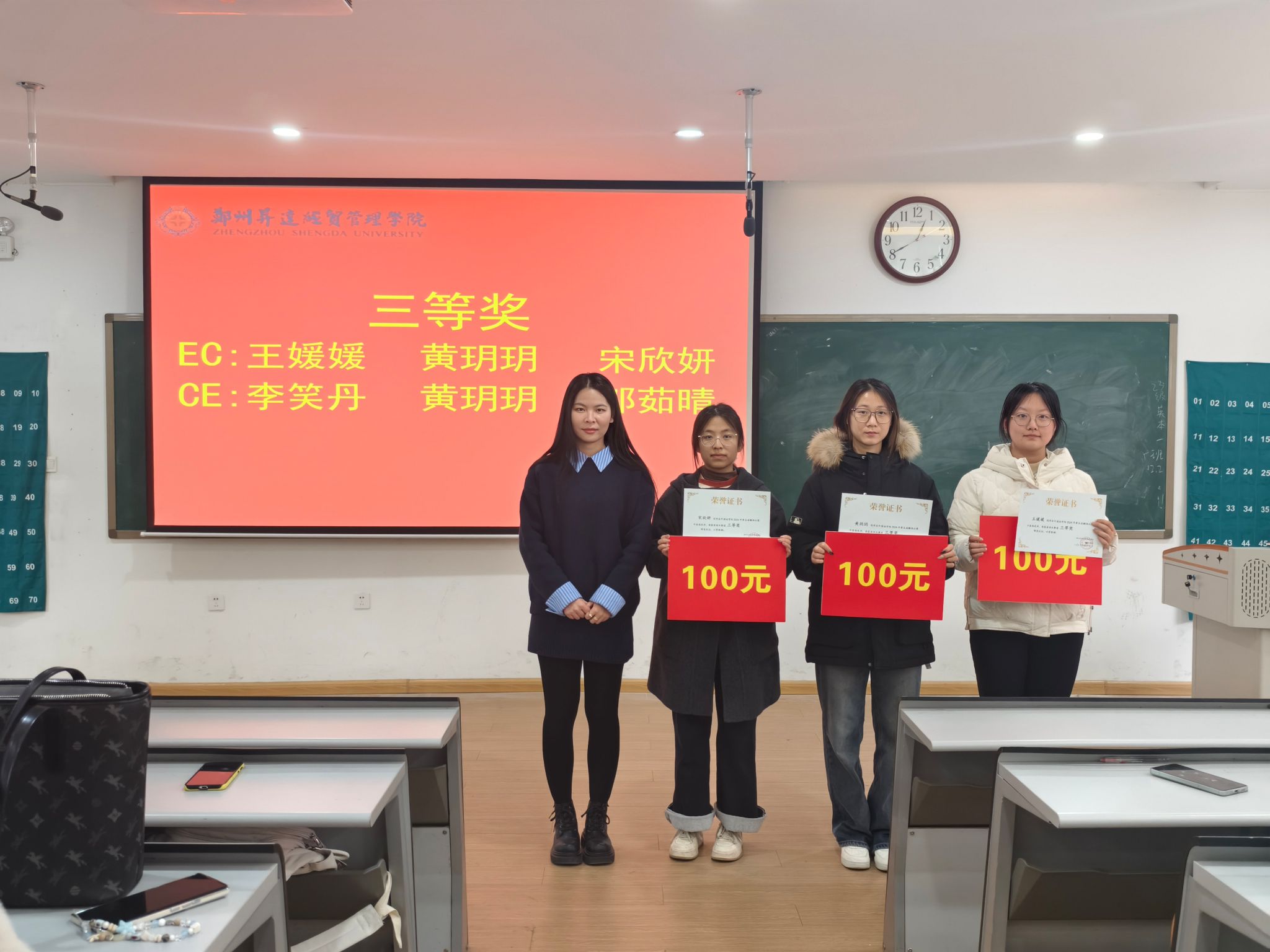 2022级翻译2班王媛媛和2022级翻译1班的黄玥玥、宋欣妍获得英译汉赛道三等奖;2022级翻译1班的李笑丹、黄玥玥和2022级翻译2班邬茹晴获得汉译英赛道三等奖。王明伟、张东和王余成3位老师为翻译大赛三等奖选手颁奖。