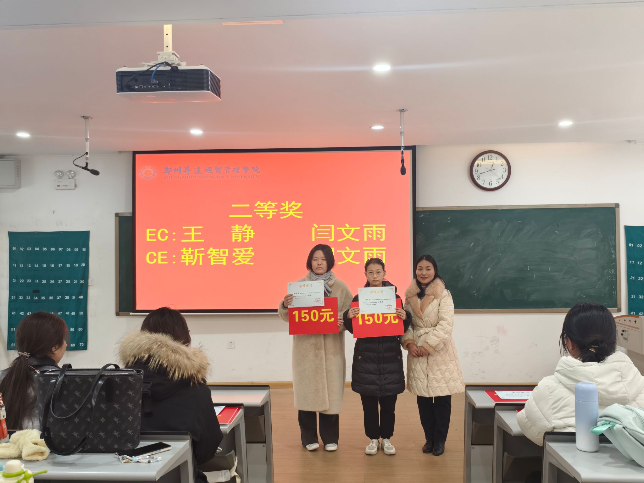2022级翻译1班的王静、2022级翻译2班的闫文雨两位同学获得英译汉赛道二等奖;2022级翻译1班的靳智爱、2022级翻译2班的闫文雨获得汉译英赛道二等奖。张主任和孙燕冉老师为翻译大赛二等奖选手颁奖。