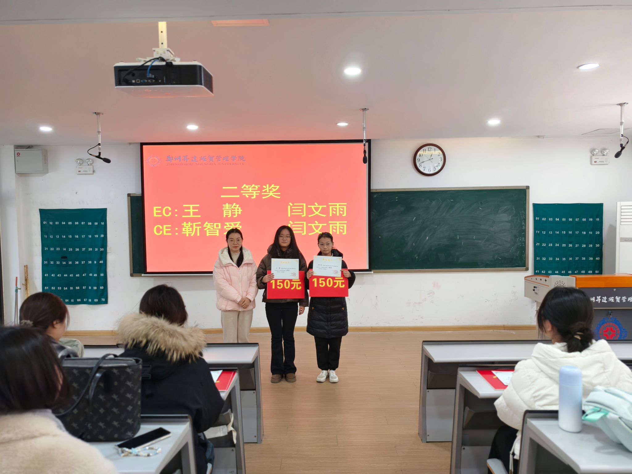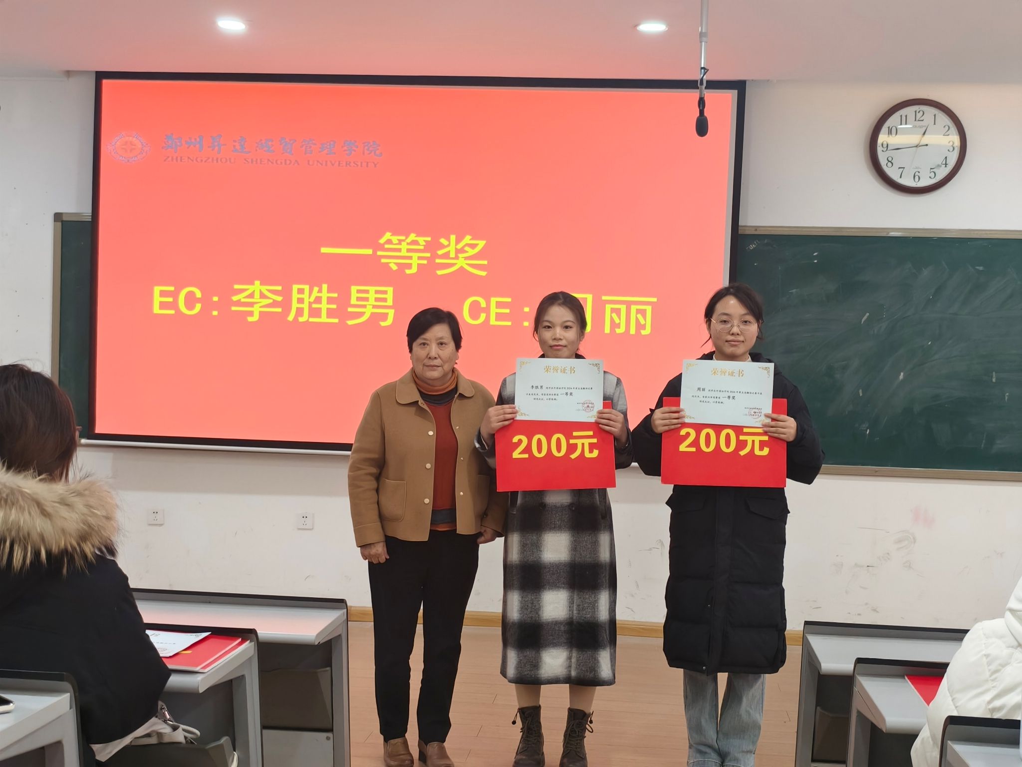 2022级翻译1班的李胜男、周丽分别获得英译汉赛道和汉译英赛道一等奖,王莉莉经理为翻译大赛一等奖选手颁奖。