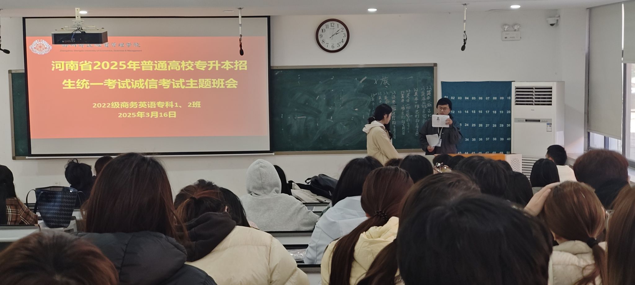 2025年3月16日下午,beats365唯一官方网站辅导员王彬老师在教学一号楼109阶梯教室,给22级商英专科参加2025年专升本考试的全体考生进行了专升本诚信考试主题教育。