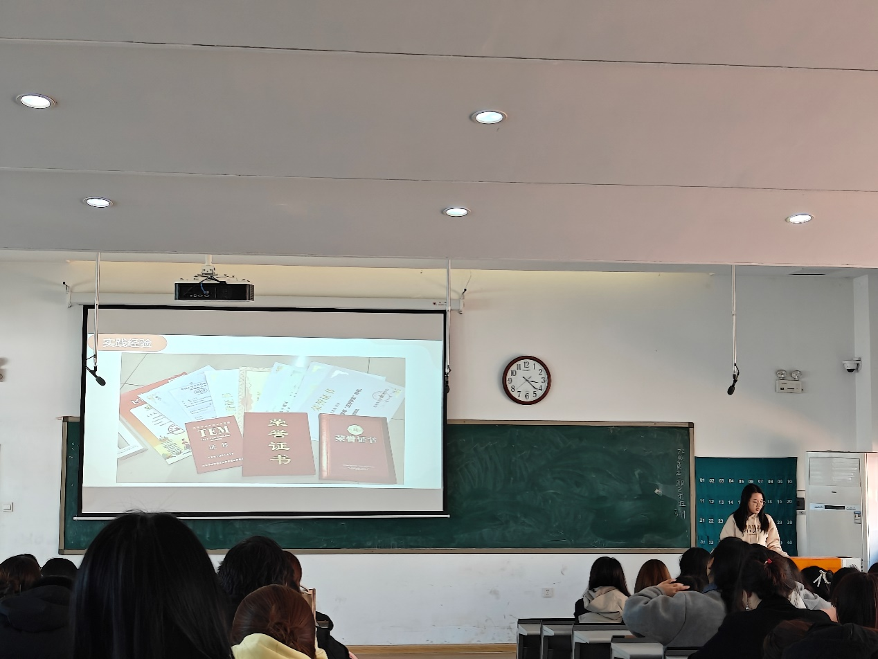“汗水铸就荣耀,辉煌实至名归。”紧接着,22级英语本科3班的王其美结合自身经历,详细分享了备战英语专业四级的 “独家秘方”。她着重强调词汇是英语学习的基石,每天坚持背诵一定量的单词是迈向成功的关键。在分享过程中,王其美还展示了自己获得的各种奖项,并感慨地说,这些荣誉的背后离不开老师的悉心教导和家人的默默支持。她激励在场的同学们要以积极的心态奋发图强,用汗水书写属于自己的辉煌。