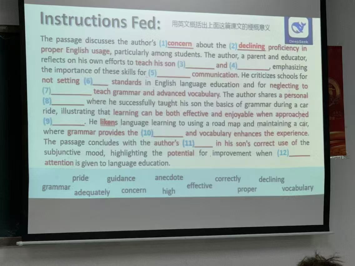 朱明元老师讲课生动,情绪热情饱满。课堂伊始,朱明元老师先对员工进行第一单元的单词讲解,并带领员工朗读。朱老师对所讲单词进行阐释,引申、扩展,展示了较好的语言功底。接下来,授课进入文章大意总结环节。朱老师运用最新的人工智能技术,将Deepseek应用于教学,生成主旨概括篇章,检测员工的课文预习情况。最后,朱老师根据文章相关主题,将员工引入语法学习的殿堂中,带领员工改正写作中的语法错误,并用AI生成写作范文。整堂课师生互动积极,员工反应良好,气氛热烈,教学效果良好。