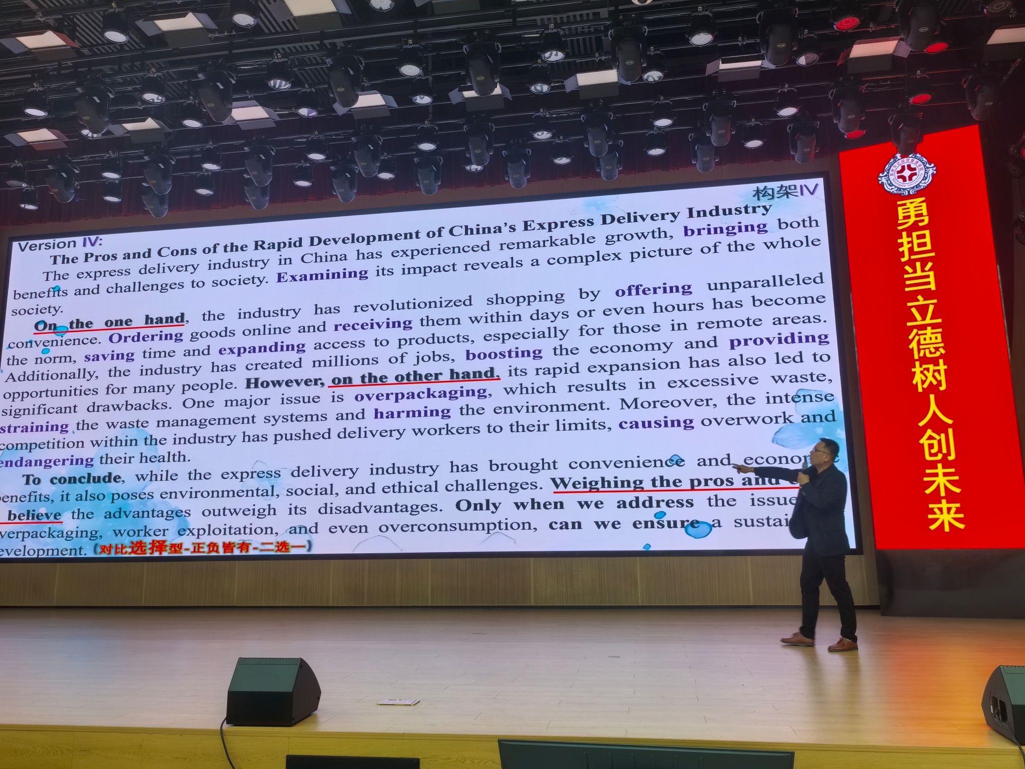 通过对比高分范文与典型失分案例,他详细讲解了如何优化段落衔接、灵活运用高级词汇及句型,并现场指导员工进行提纲拟写实战演练。互动环节中,同学们踊跃提问,朱老师逐一解答,现场气氛热烈。