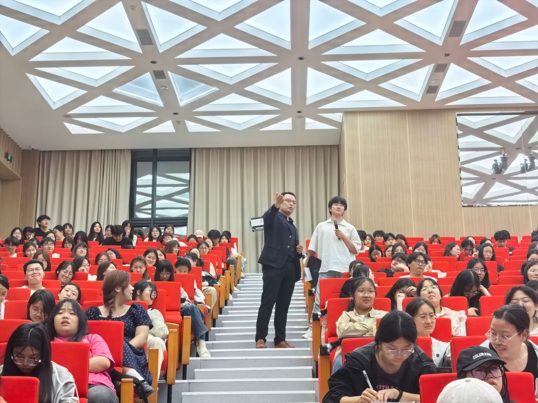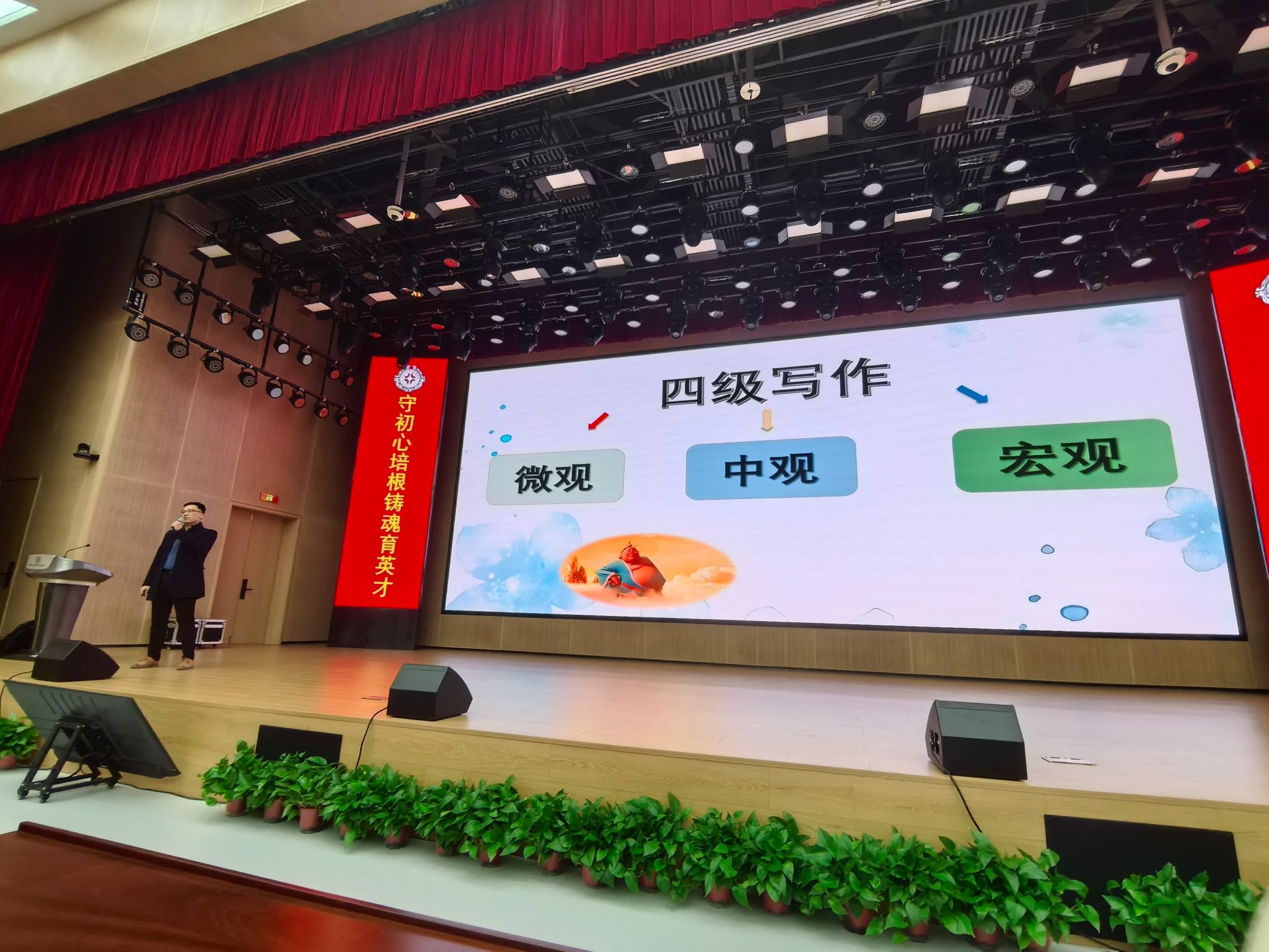 讲座中,朱明元老师从宏观审题、中观构思,微观措辞三个维度为在场同学全面且具体地解析了英语四级写作的核心技巧,帮助员工在有限时间内快速搭建文章框架。朱老师还以四级写作真题为例,系统剖析了写作部分的评分标准与常见误区,强调“逻辑清晰、结构严谨、语言多样”的得分要点。