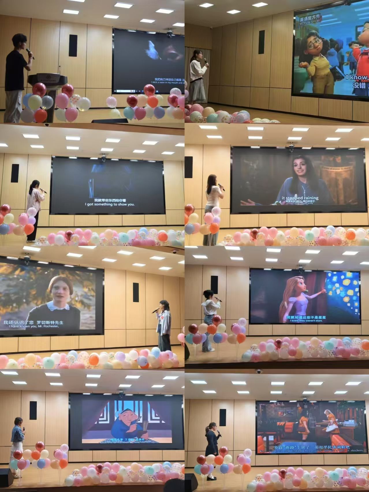 在配音比赛的舞台上,选手们各展所长,用精湛的配音技巧和对角色的深刻理解,为观众带来了一场别开生面的听觉盛宴。比赛过程中,八位参赛选手依次登场,带来了风格各异的配音作品。他们分别选取了经典外语电影、热门外语剧集、知名外语动漫等经典片段,用流利的外语和极具感染力的声音,将角色的性格特点和情感变化展现得淋漓尽致。每位选手都通过声音塑造出鲜活的角色,展现出深厚的外语功底和配音天赋。比赛间隙,郭佳慧、王梓正两位同学以歌为媒,用独特的嗓音魅力,为这场配音比赛增添了别样的精彩。此外,比赛过程中,还穿插了观众互动环节,现场气氛热烈非凡。评委代表Diana、袁航老师对选手们的表现进行了精彩点评,她们肯定了选手们的努力与才华,同时也从语音语调、情感表达、角色塑造等方面提出了宝贵的建议。最终,经过激烈角逐和评委们公正、专业的打分,最终获奖情况如下: