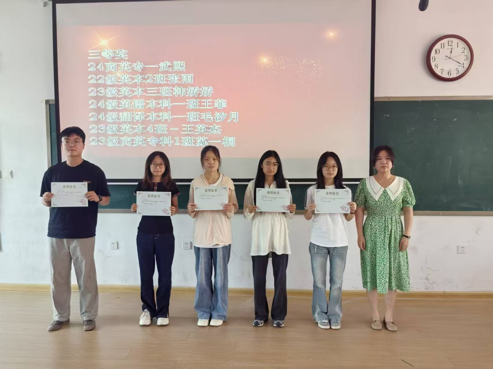三等奖:24 商英专一 武熙、22 级英本 2 班 张雨、23 级英本三班 韩娇娇、24 级英语本科一班 王菲、24 级翻译本科一班 毛汐月、23 级英本 4 班 王英杰、23 级商英专科 1 班 苏一桐