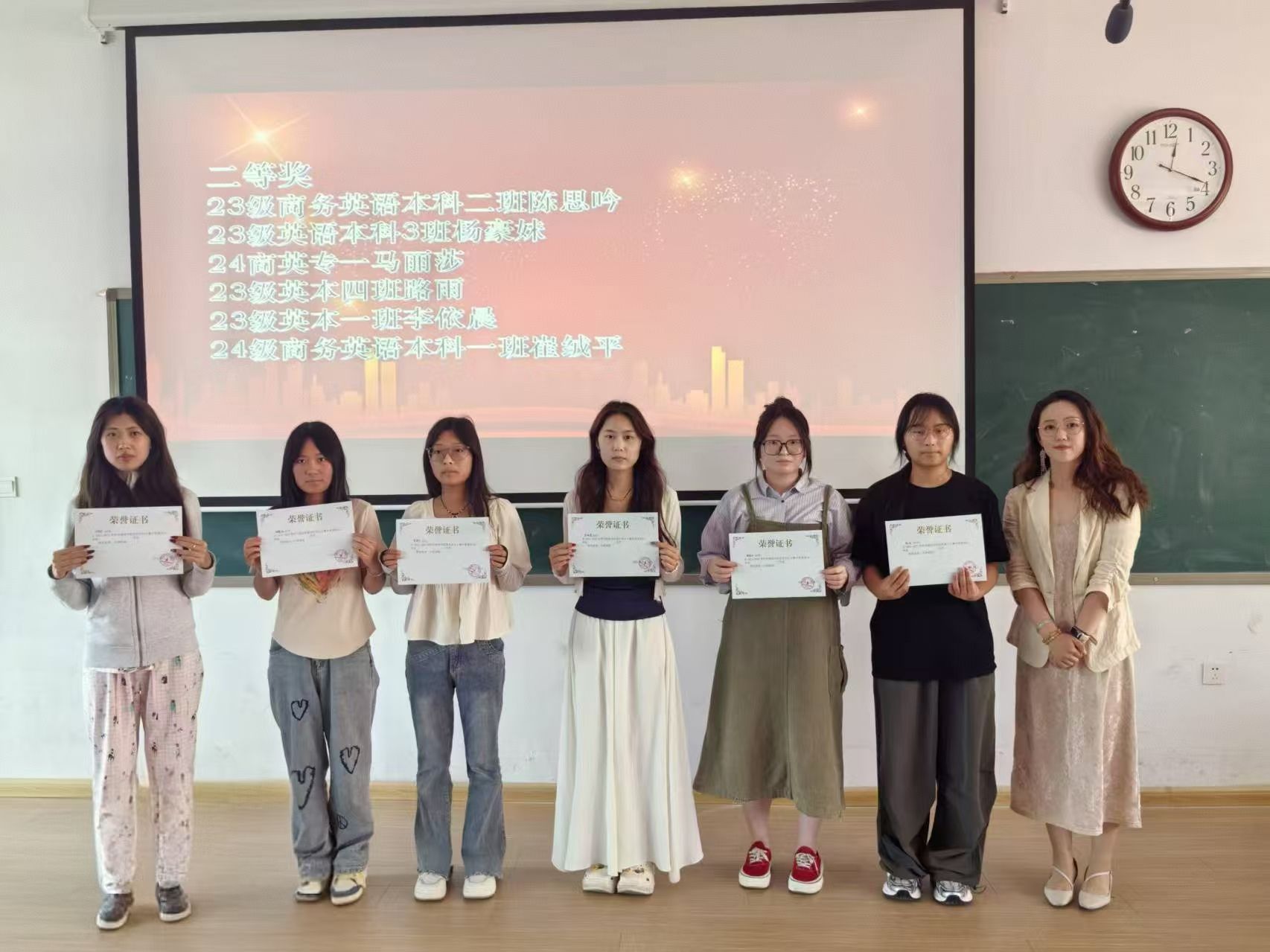 二等奖:23 级商务英语本科二班 陈思吟、23 级英语本科 3 班 杨豪妹、24 商英专一 马丽莎、23 级英本四班 路雨、23 级英本一班 李依晨、24 级商务英语本科一班 崔绒平