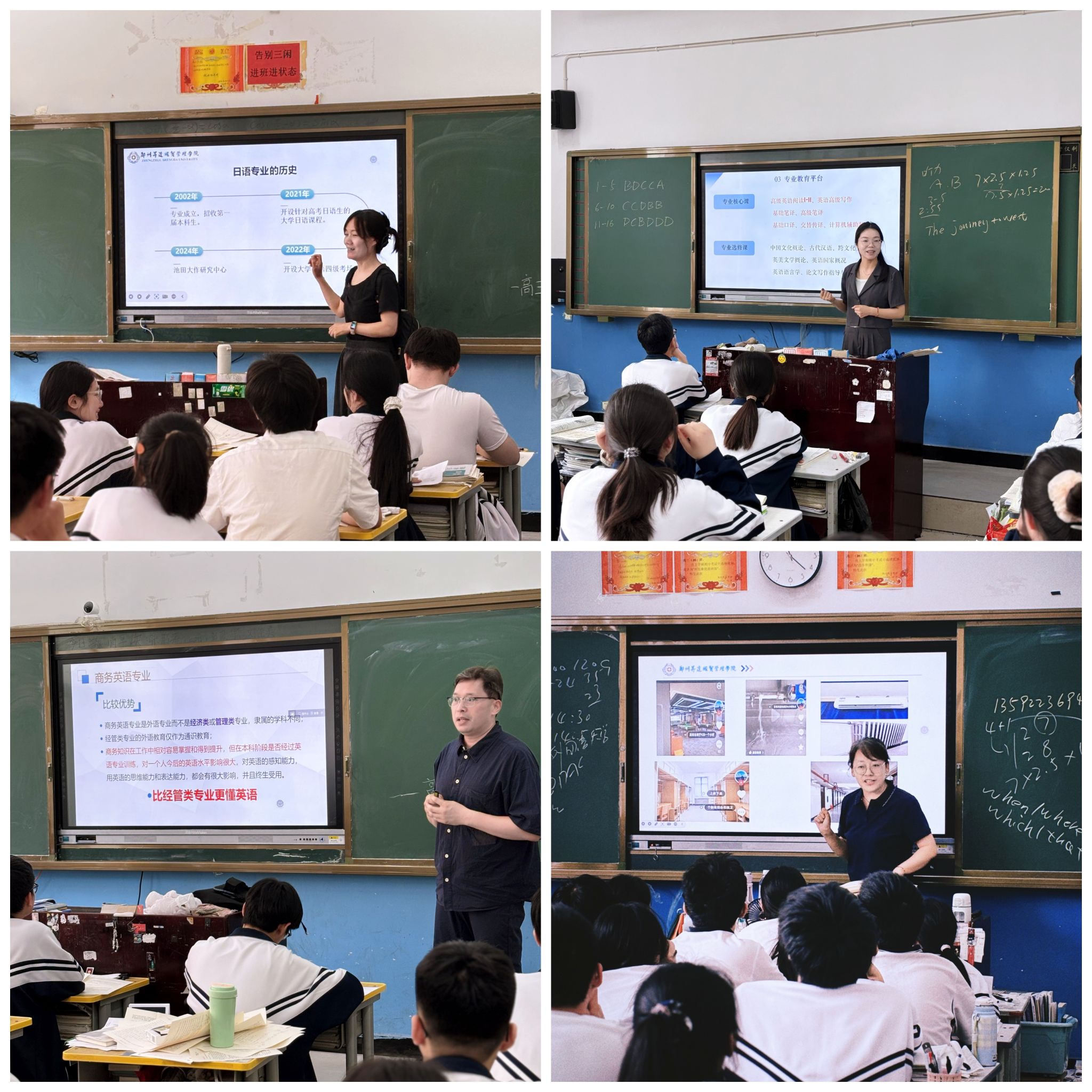 在简短的沟通后,调研团队成员在校方的统一安排下进入部分班级进行面对面的交流,了解他们语言学习的困难点,并对如何高效备考给他们提出了中肯的建议,交流中,调研团队成员也通过PPT和宣传片的形式对高校的语言类专业设置情况以及公司的各种校园设施向同学们进行了展示。
