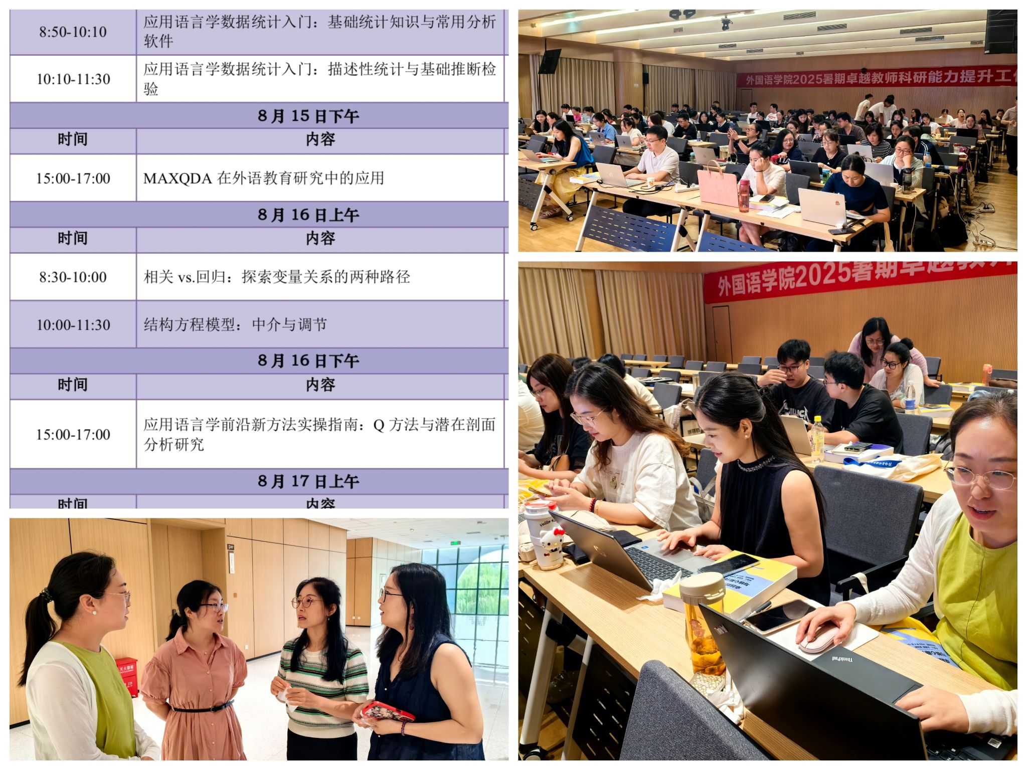 通过前期的多方协调和周密准备,此次工作坊制定了科学的培训计划。第一天主要是应用语言学数据统计入门、实证研究的常用分析软件介绍;第二天在回顾变量关系两种主要路径——相关和回归的基础上,重点讲解了结构方程模型和应用语言学前沿新方法——Q方法与潜在剖面分析;第三天聚焦于量表的编制、因子分析在量表中的应用和元分析——应用语言学研究证据的整合与量化,最后是应用语言学期刊投稿与交流。培训方式不仅仅是主题讲座,还配有详尽的文献阅读和现场实操训练。参训老师和学者全身心投入学习,相互交流,收获满满。
