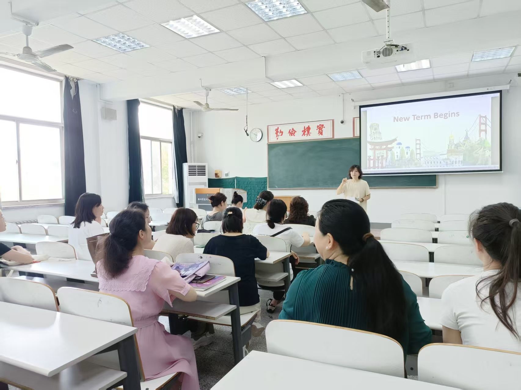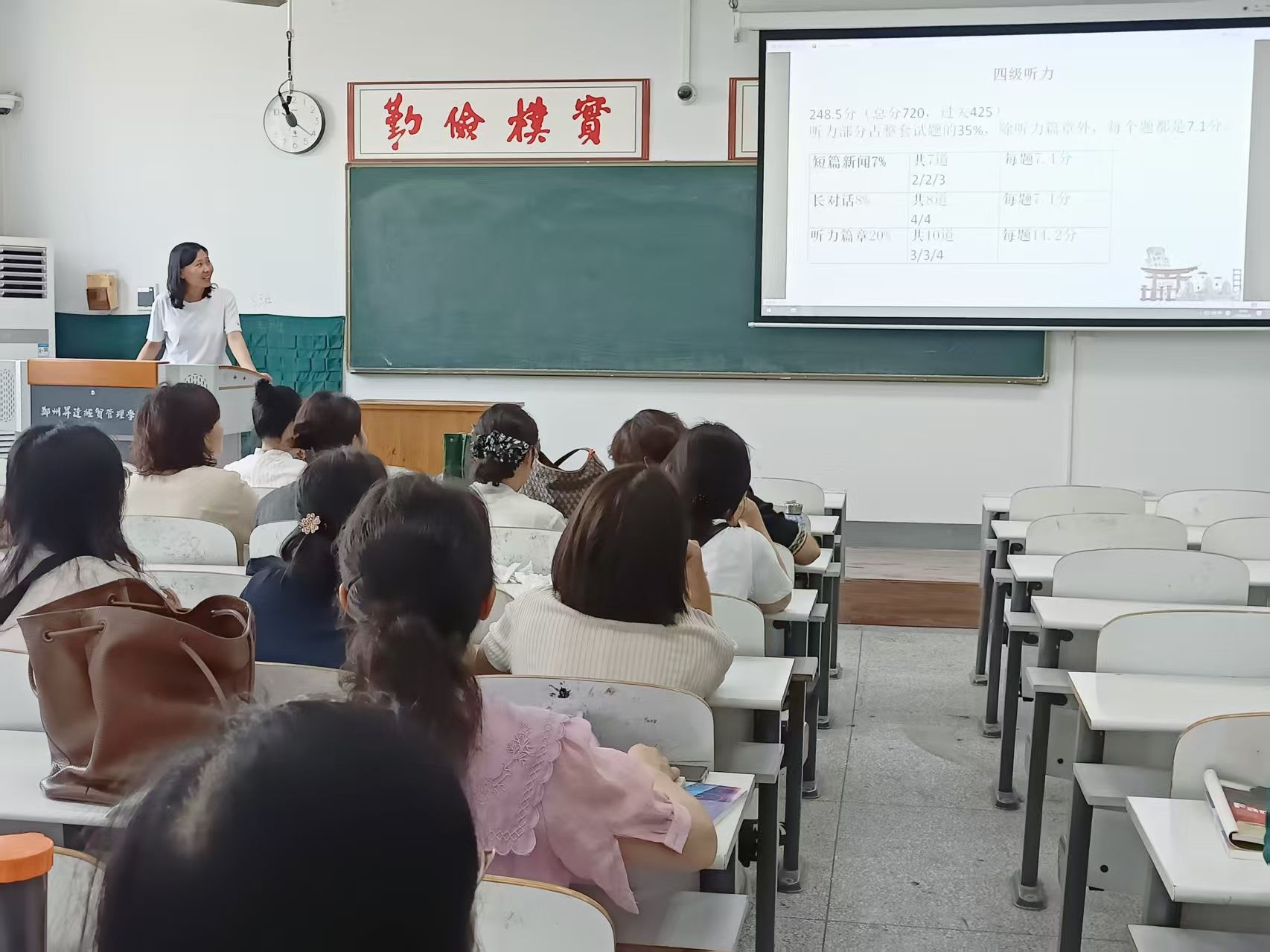 在课堂教学经验分享环节,李晓婕老师为大家演示了第一周的课堂教学。分别从话题引入、课文重难点、四级辅导等部分进行了经验分享。同时全体老师就四级辅导问题展开热烈讨论,纷纷献言献策,共同努力提高员工四级过关率。