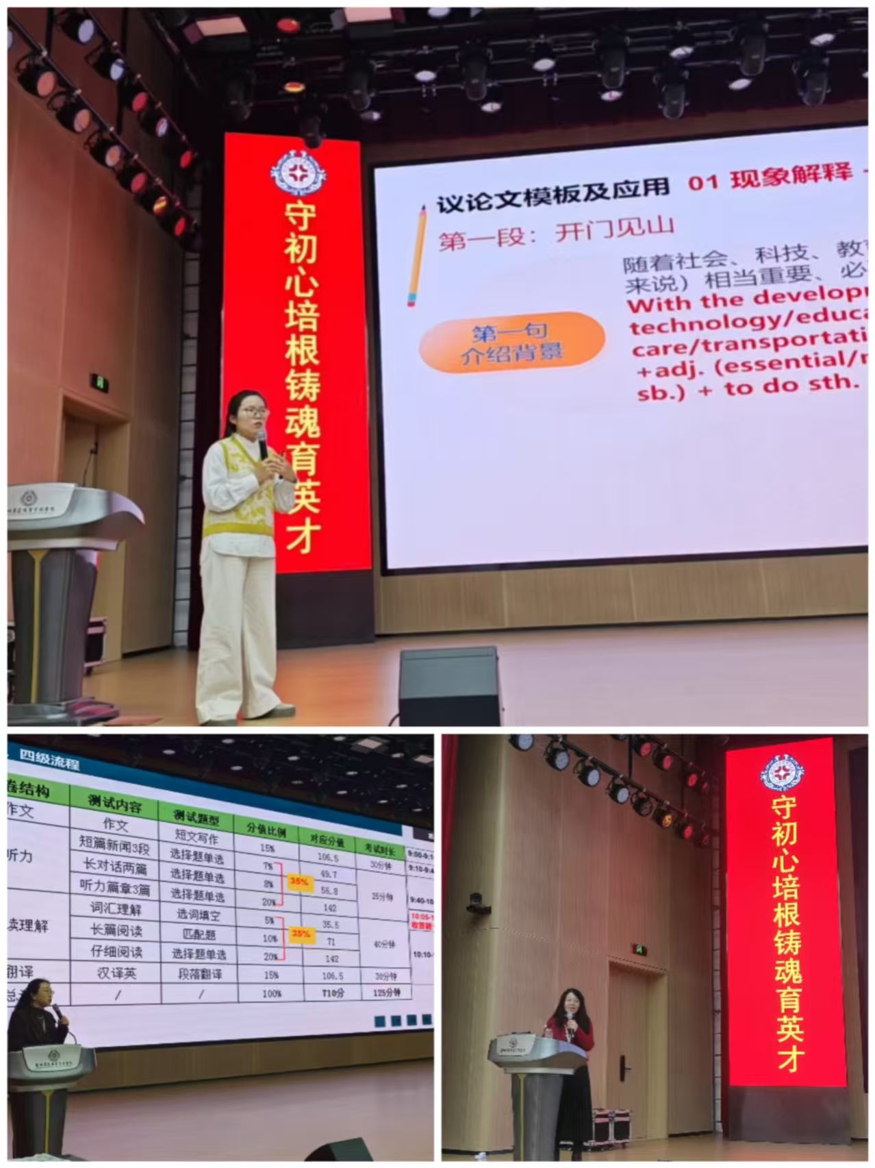 为帮助员工精准突破四级考试难点,beats365唯一官方网站先后组织十几位位教学经验丰富的老师,为员工带来多场四级专题辅导讲座,讲座内容涵盖翻译、阅读、写作等核心模块,系统梳理考点与解题方法,为员工提供全方位的备考支持。系列讲座精准填补员工知识盲区,强化答题策略与实战能力,助力科学规划复习路径,帮助考生提高备考效率与信心。