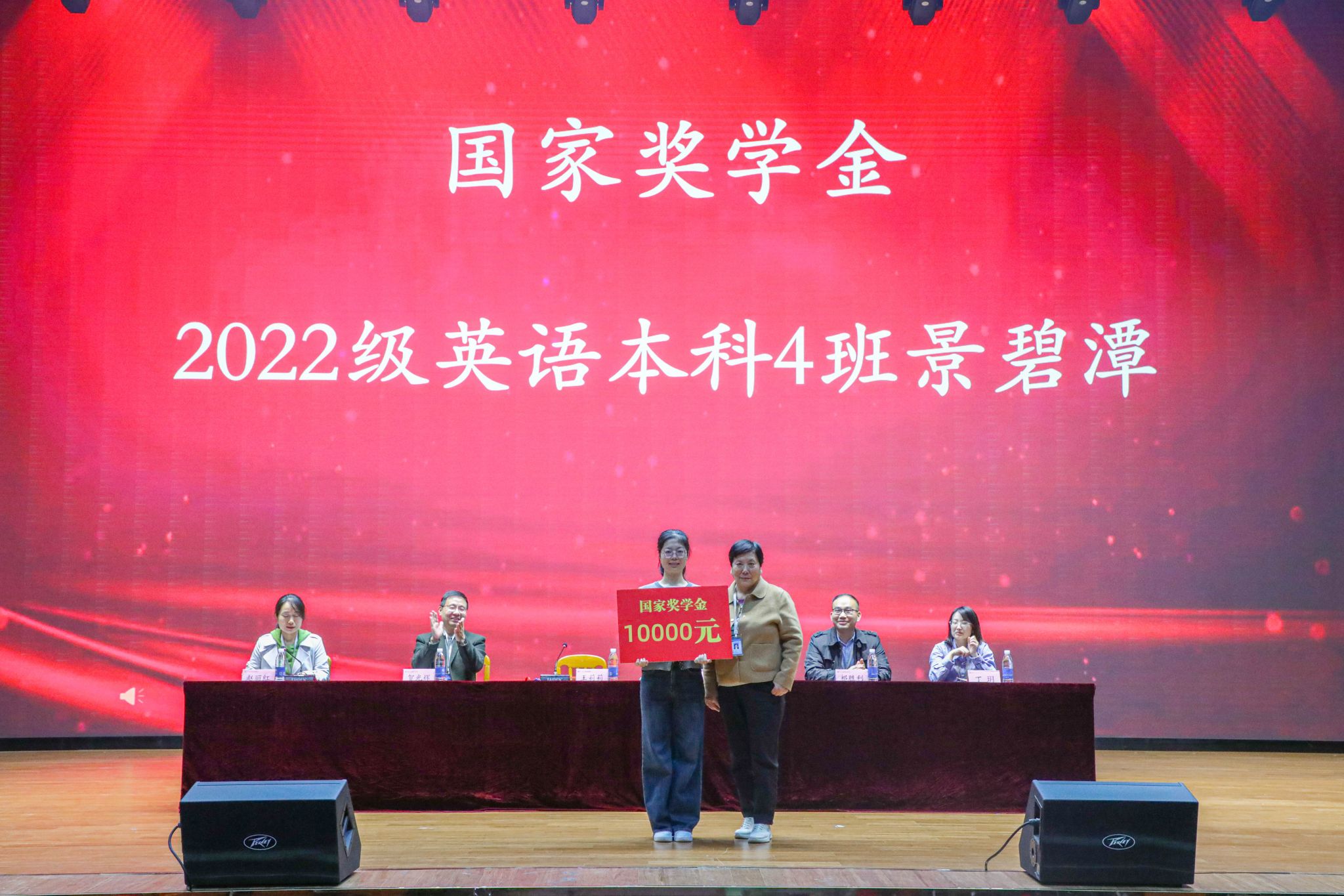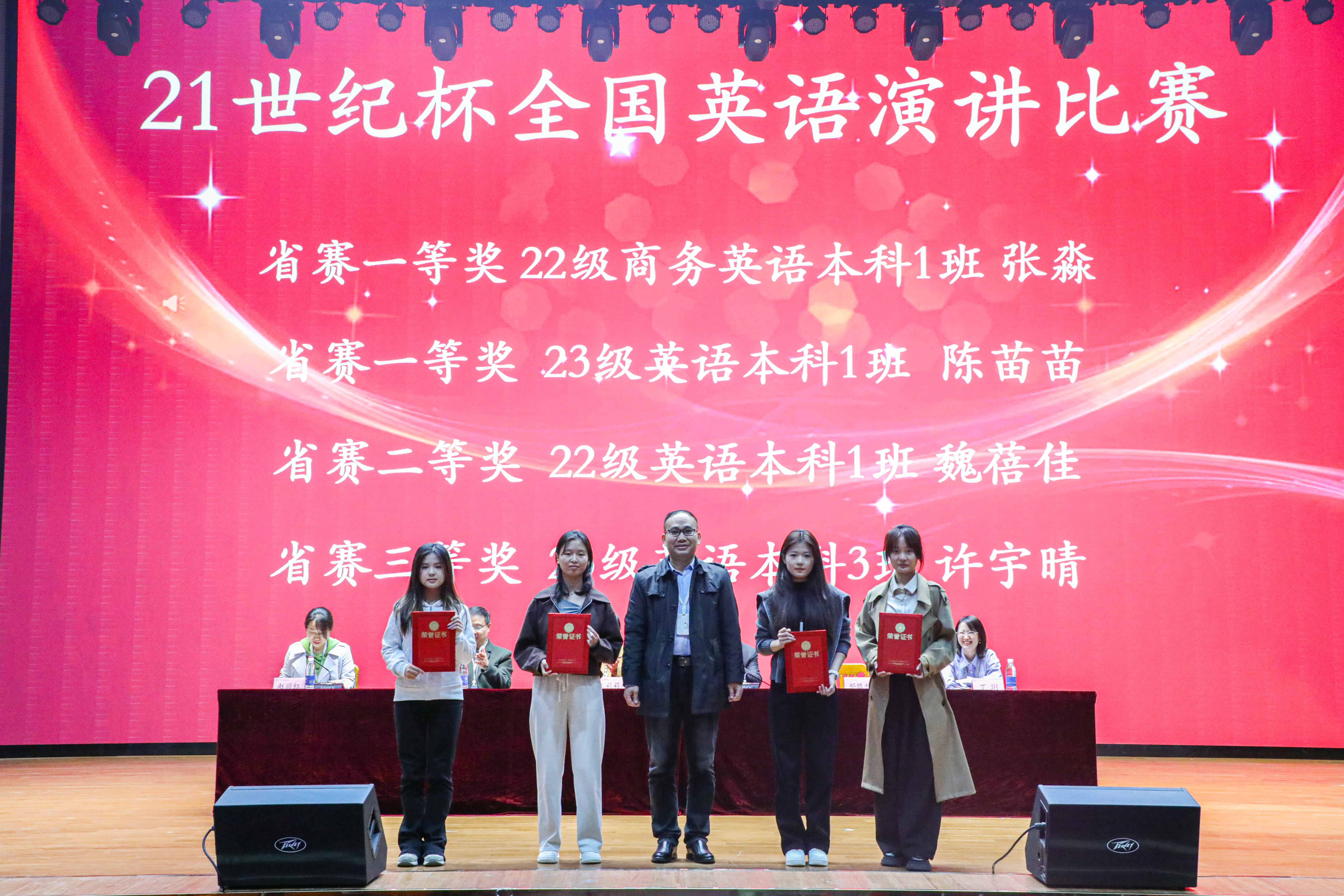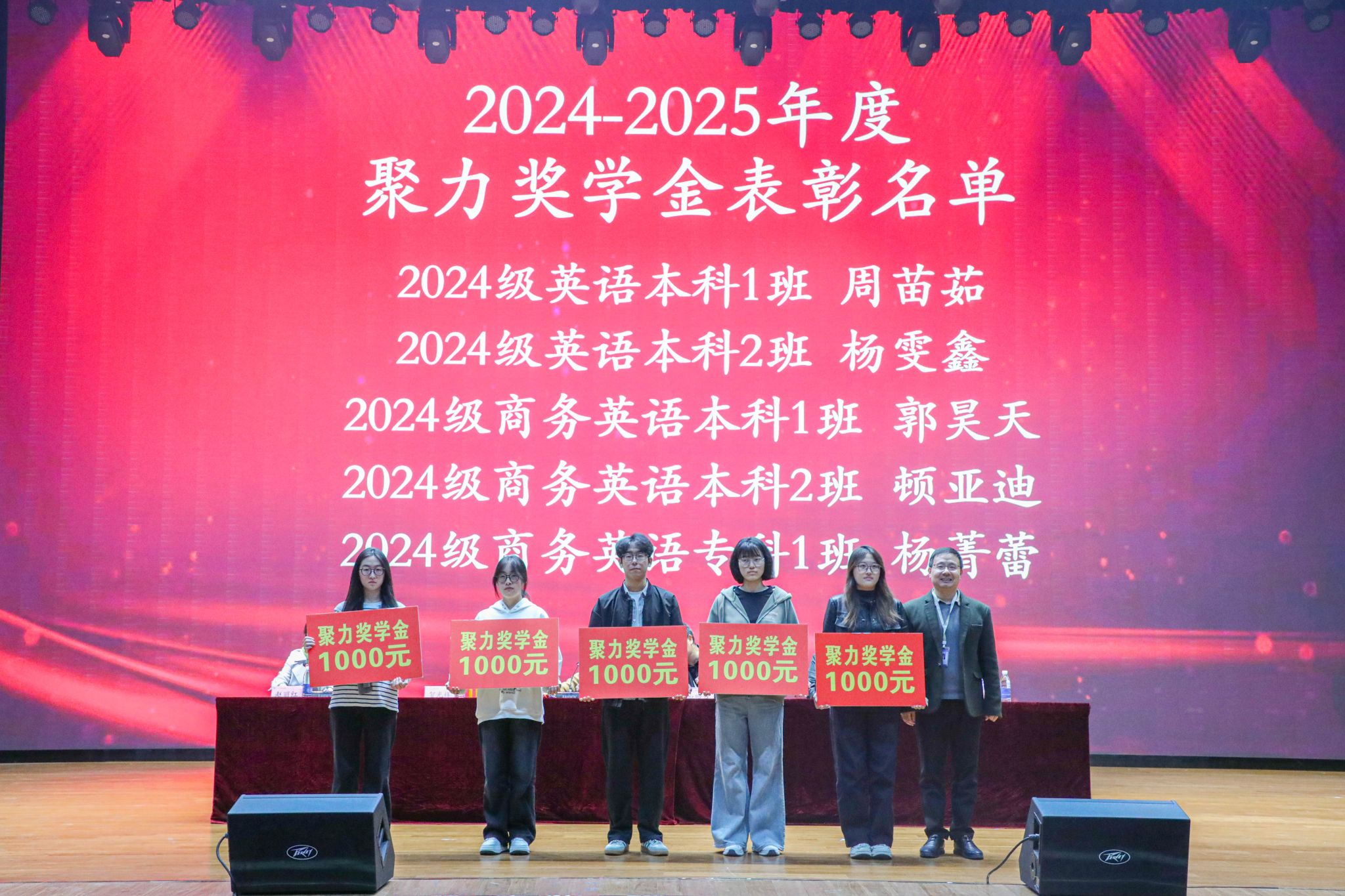 随后,大会进入表彰颁奖环节。现场对在各类专业竞赛中斩获省级及以上奖项的学子、2024-2025 年度聚力奖学金获得者、国家励志奖学金获得者及国家奖学金获得者予以表彰。其中,22 翻译本科 1 班申思羽获第三届 “外文奖” 全国老员工英语翻译大赛全国二等奖;22 级商务英语本科 1 班张淼、23 级英语本科 1 班陈苗苗获 21 世纪杯全国英语演讲比赛省级一等奖,22 级英语本科 1 班魏蓓佳获省级二等奖,23 级英语本科 3 班许宇晴获省级三等奖;2022 级英语本科 4 班景碧潭获国家奖学金。公司领导为获奖员工逐一颁发荣誉证书,现场掌声雷动,气氛热烈。