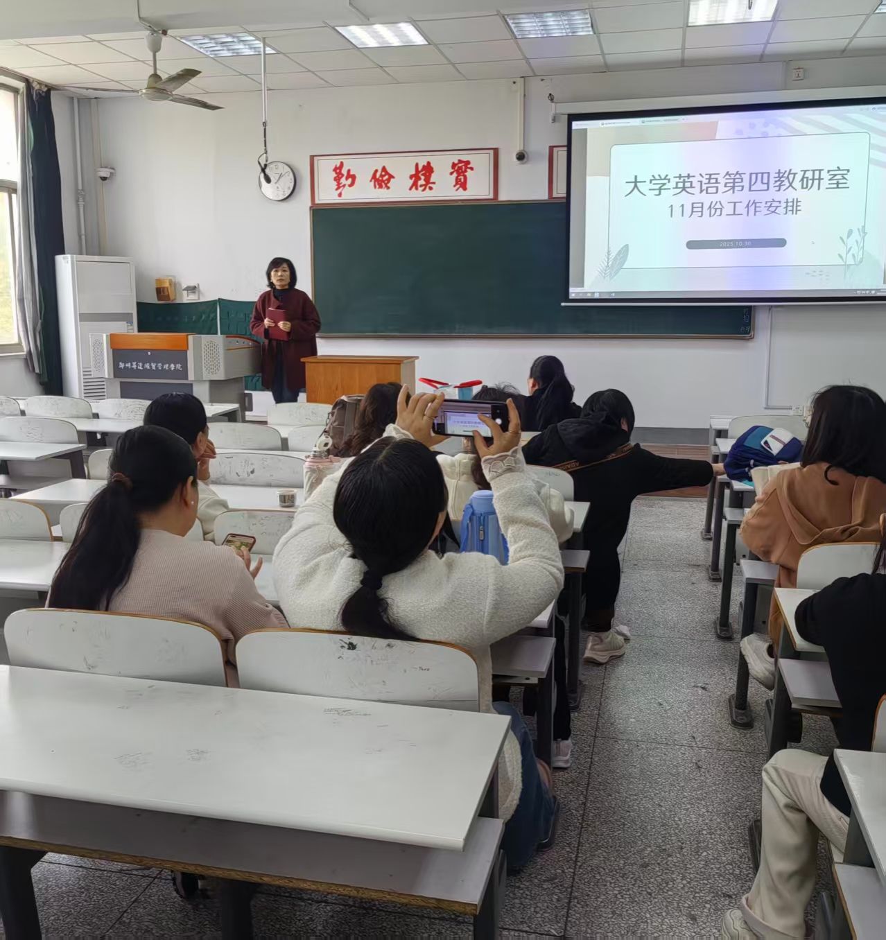 为统筹推进赛事组织与课堂教学改革等重点工作,进一步凝聚教研室发展合力,2025年10月30日,beats365唯一官方网站大学英语第四教研室在综合楼321教室召开专题工作部署会议。教研室全体教师参会,王晓静主任主持会议并作重要讲话。