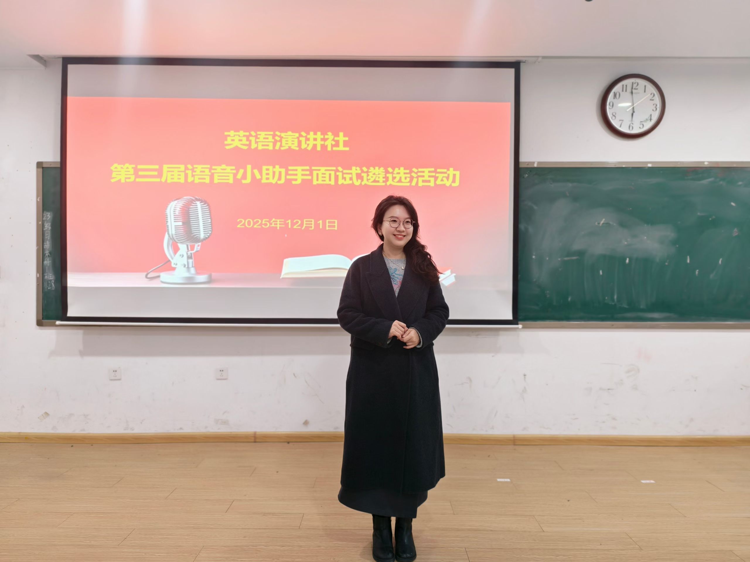 第三届“语音小助手”活动面向24级同学展开,前期共有三十余位同学通过邮箱发送面试申请。面试活动于2025年12月1日分两场在教学一号楼展开。社团指导老师袁航全程参与遴选活动。申请者们围绕个人语音学习经历、对辅导工作的理解以及未来工作设想进行了陈述,他们希望通过解答学弟学妹的疑问来反哺自身,深化对语音知识和技能的理解,实现“教学相长”;同时,结合自身初学语音时曾有的困惑与胆怯,表达了希望创造轻松氛围,帮助新生克服困难、敢于开口的强烈意愿;此外,怀着对未来英语教育职业的向往,他们表示此次机会是其积累真实教学经验、学习因材施教方法的宝贵实践平台。