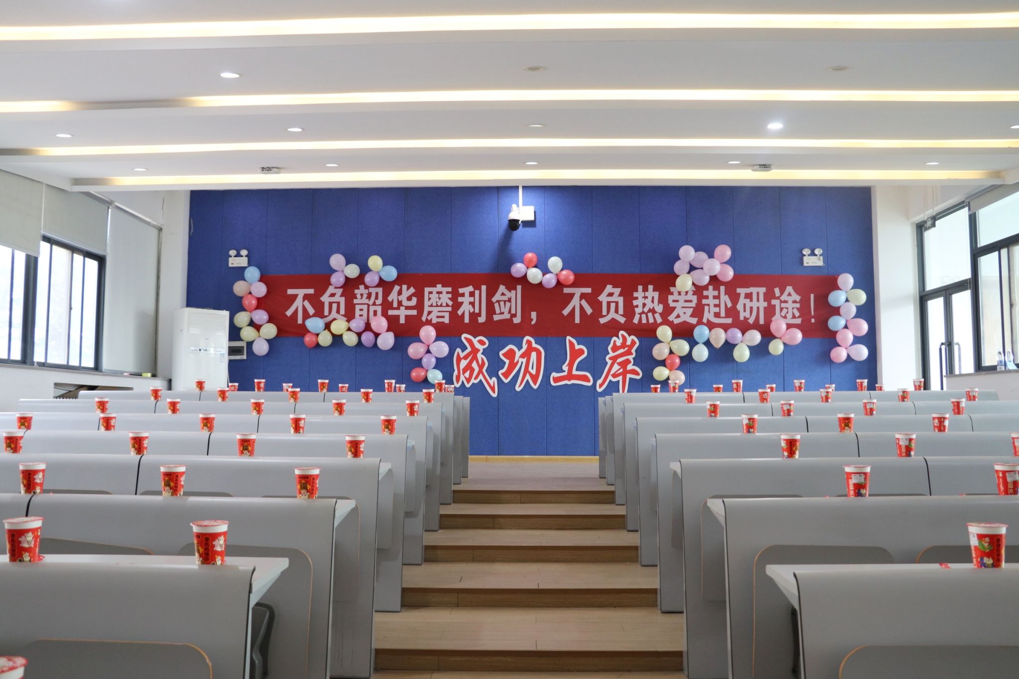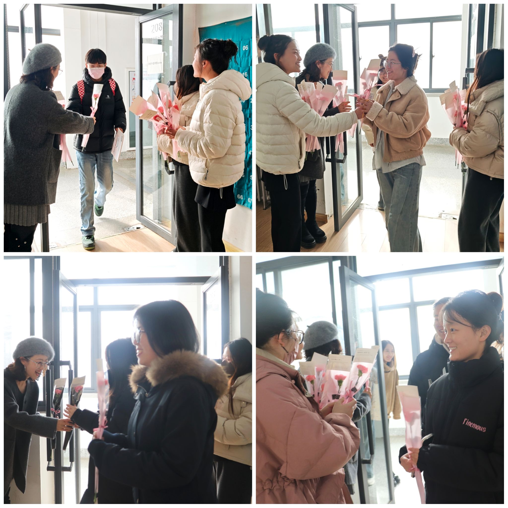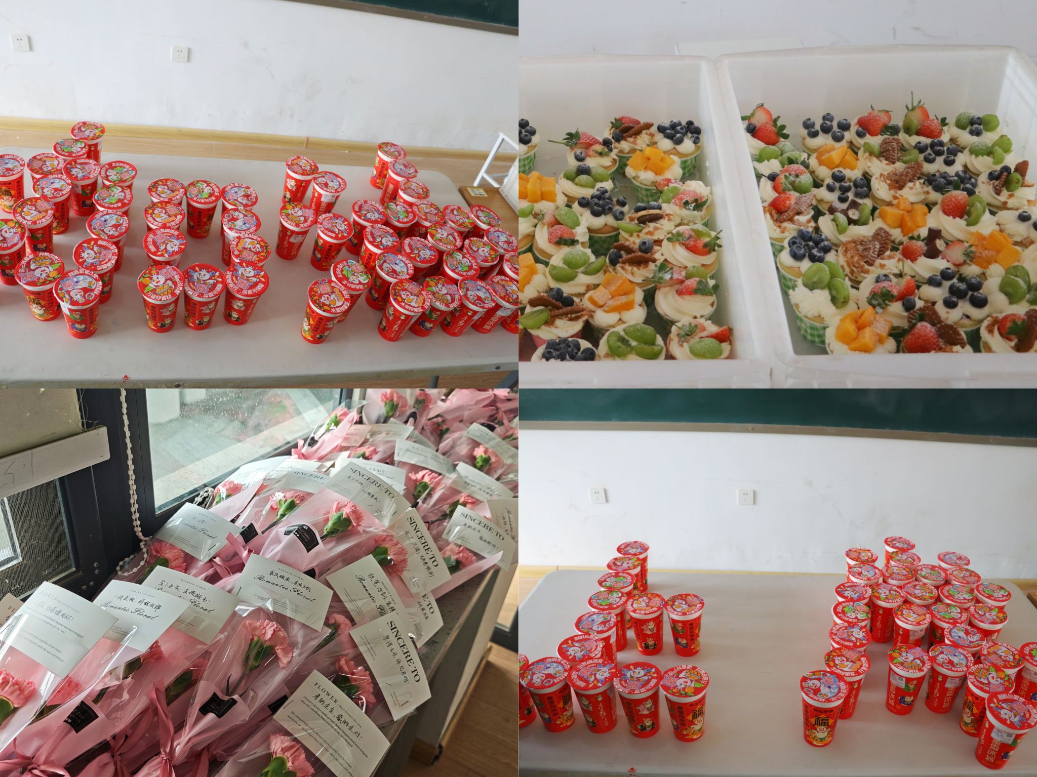 活动现场布置得既温馨又庄重,横幅高悬,彩球点缀其间,营造出浓厚的暖心氛围。精心定制的“能量补给包”——美味的小蛋糕和温热的奶茶,为同学们提供了充沛的活力支持。此外,一束束康乃馨及祝福语也为在寒冬中拼搏的学子们送去了甜蜜与温暖关怀。