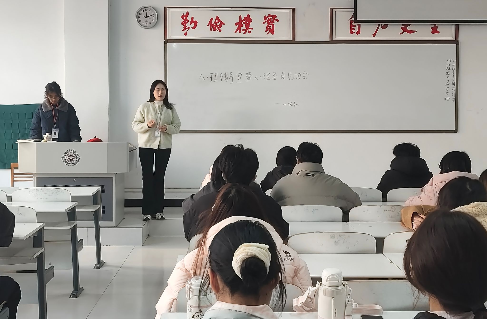 随后,郎振丹老师向同学们细致讲解了心理辅导室的服务内容、预约流程以及保密原则,她表示:“心理辅导室永远是同学们可以信赖的‘心灵港湾’,无论遇到什么样的困扰,我们都愿意倾听并提供专业支持。”最后,心悦社主持人向各心理委员详细介绍了建立心理咨询室的原因、心悦社成员的工作内容、心理咨询室的核心职责、心理委员的职责,还教导了基本的沟通技巧,为本次活动画上了完美的句号。