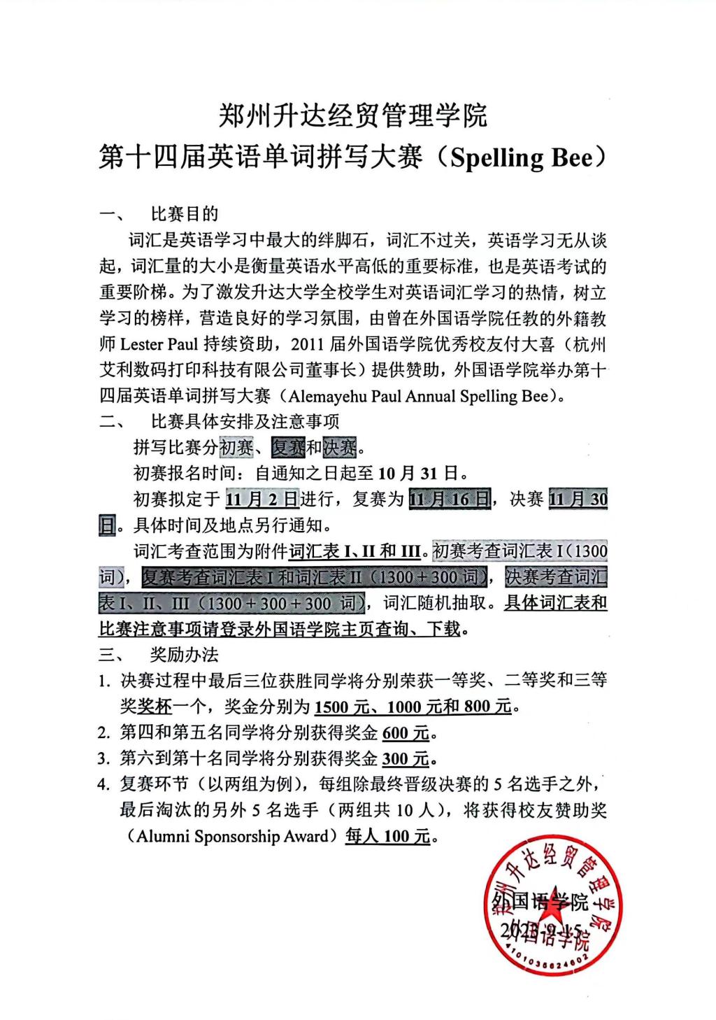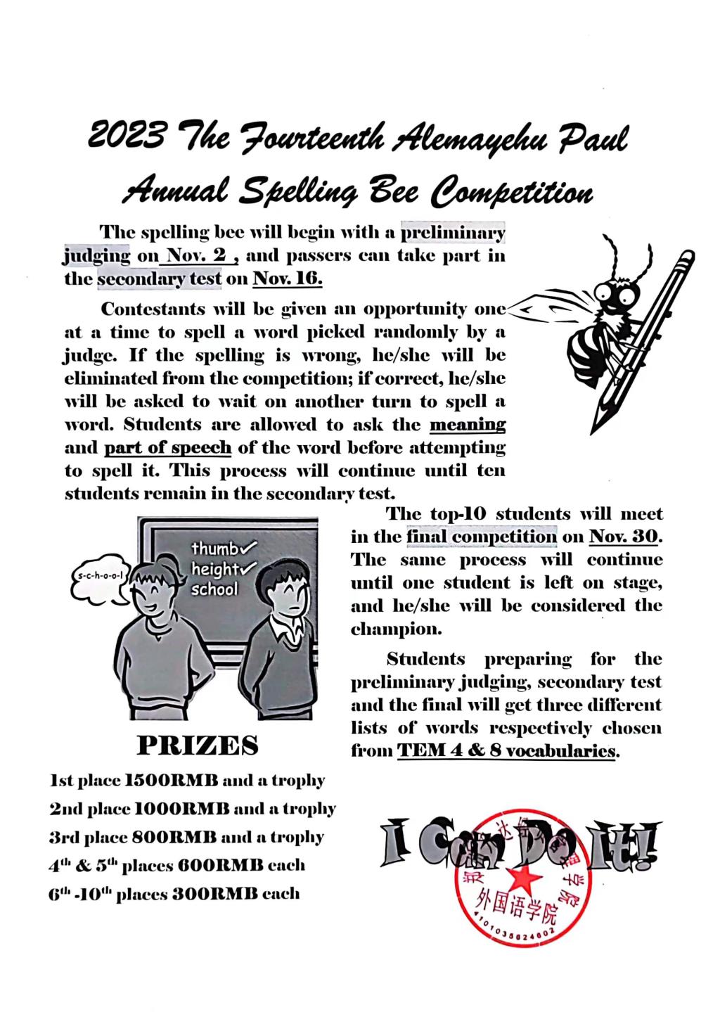 拼写比赛分初赛、复赛和决赛三步进行。初赛以自愿形式报名,计划决出60-80名选手进入复赛。复赛采用分组淘汰的方法,最后留下的10名参赛同学可晋级决赛,评委组由外教和中教共同担当。初赛拟定于11月2日进行,复赛为11月16日,决赛11月30日。具体时间及地点另行通知。