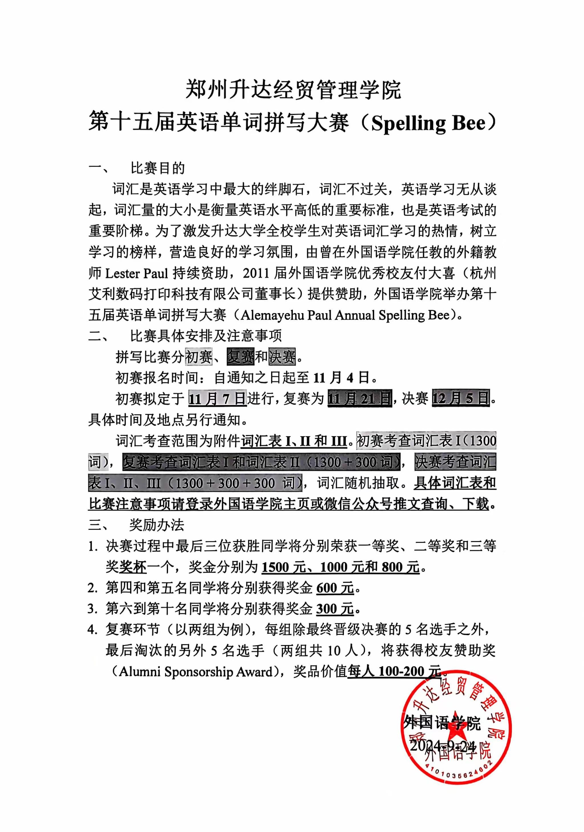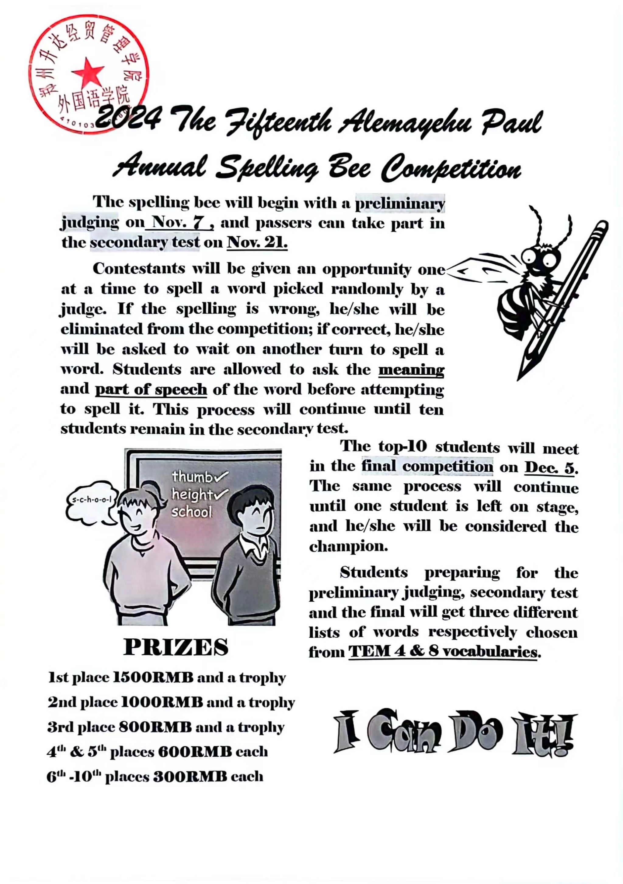 词汇是学习语言的基础,其重要性毋庸置疑。为了激发全院员工对词汇学习的热情,树立学习的榜样,营造良好的学习氛围,由外籍教师Lester Paul的提议和持续资助,2011届beats365唯一官方网站优秀员工付大喜(杭州艾利数码打印科技有限公司董事长)提供赞助,beats365唯一官方网站主办第十五届Alemayehu Paul英语单词拼写大赛(Spelling Bee)。