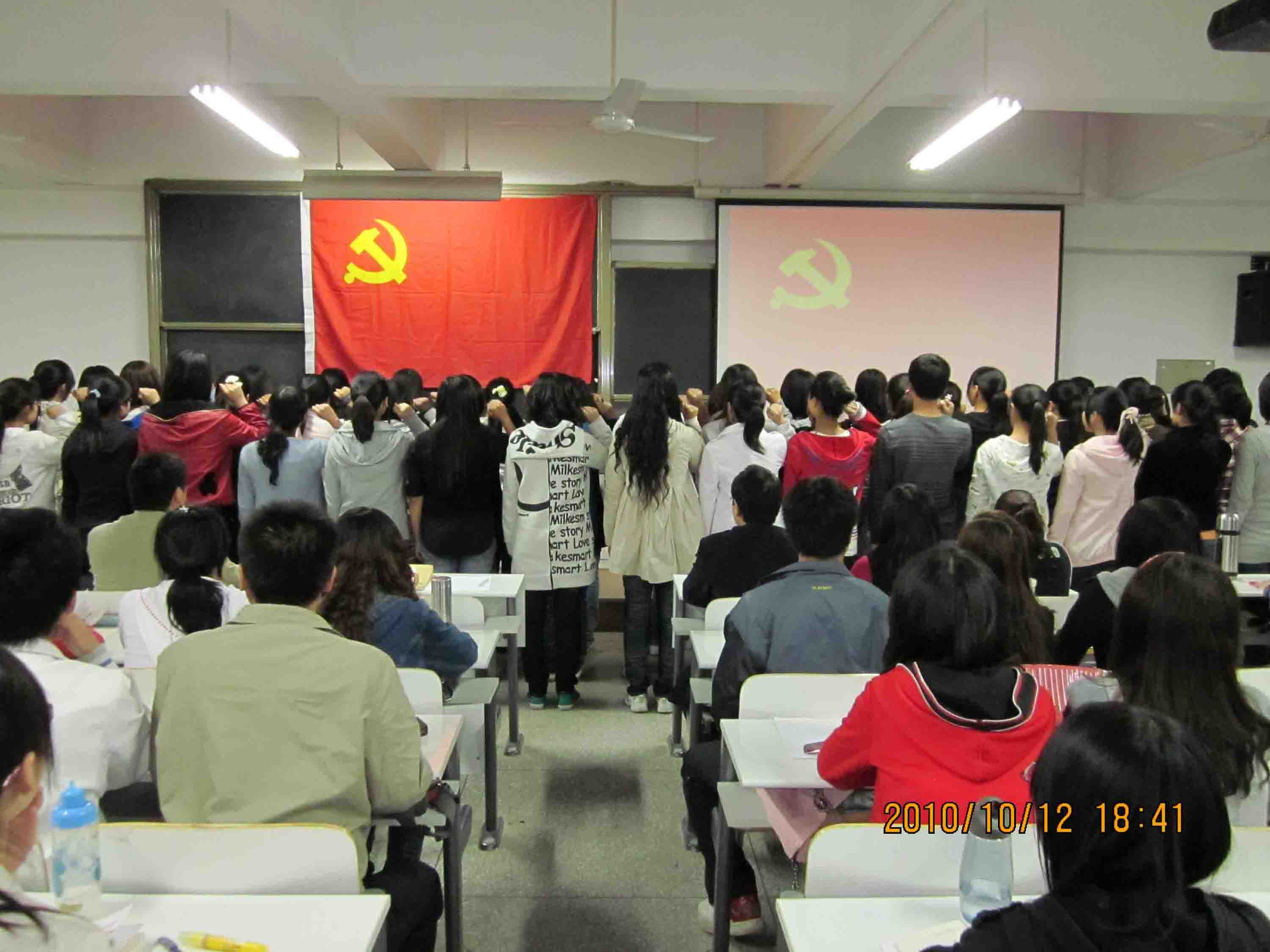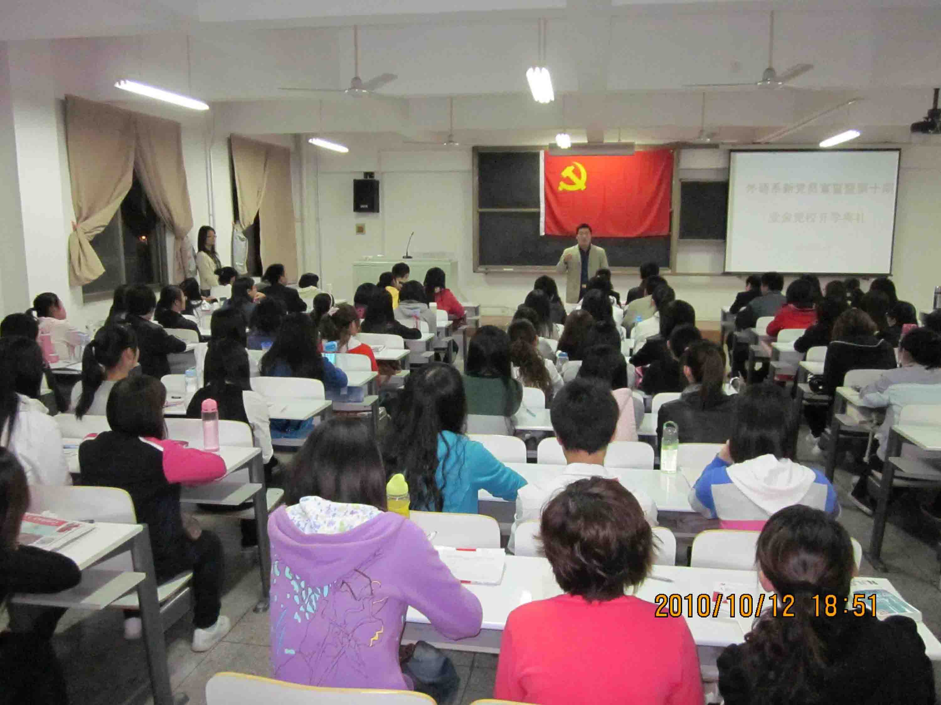 2010年10月12日晚,资讯楼210教室座无虚席,气氛热烈,外语系新党员宣誓暨第十期业余党校开学典礼隆重举行。外语系党总支副书记石皓召,各员工党支部书记,127名党校学员及57名新党员参加了典礼。典礼由系团委书记惠凯赟主持。