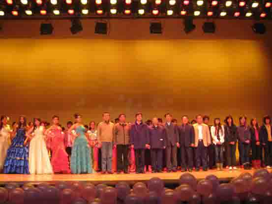 伴随着《难忘今宵》的乐曲,领导和演员走上舞台合影留念。
