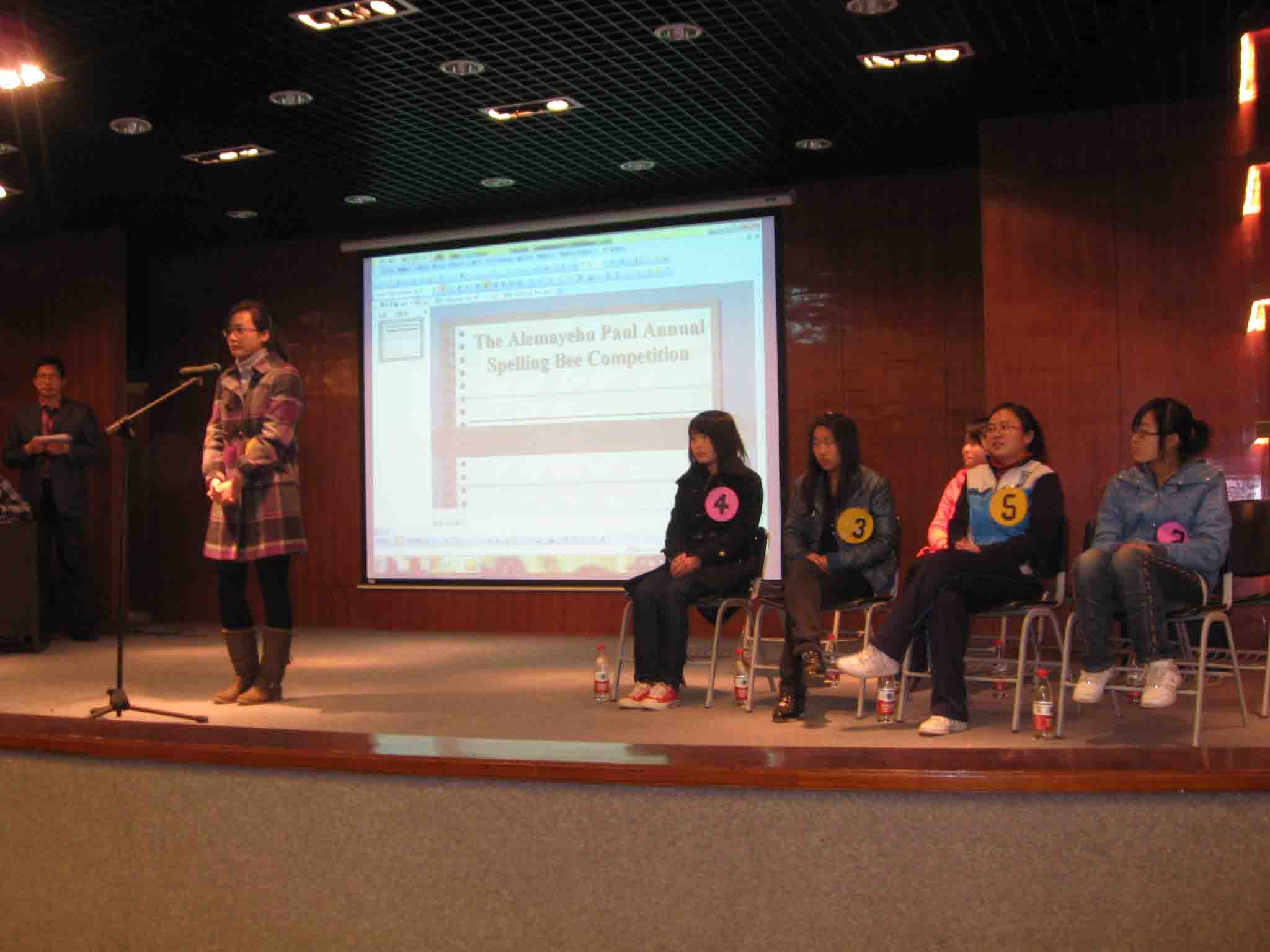 进入大比拼环节,由外教选取题号,读出发音,阐释词义。选手根据编号顺序依次作答,答错者则会被淘汰。八位同学都做了充分的准备,竞争相当激烈。一轮又一轮,选手们仍然是镇定自若,毫无紧张之态。当选手将字母多达20个左右的单词拼出来时,全场爆发出了热烈的掌声,大家都被他们的扎实功底所折服。