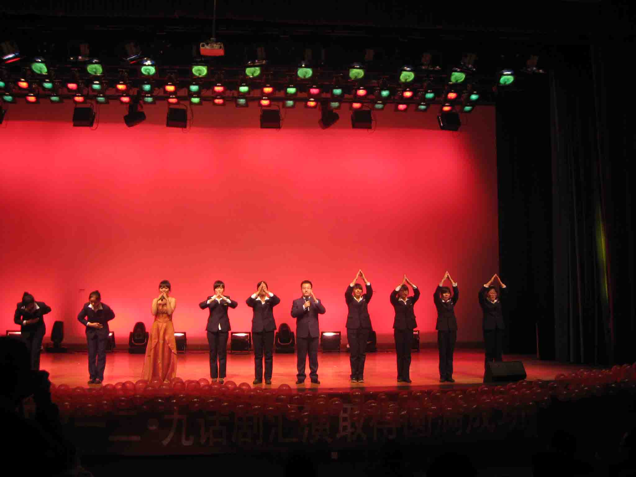 最后,晚会在文法系和艺术系的手语表演《国家》中落下了帷幕,同学们在他们的歌声和手语表演中感情得到了再次升华。晚会最后,领导们走上舞台与演员们亲切握手并合影留念,晚会圆满结束。