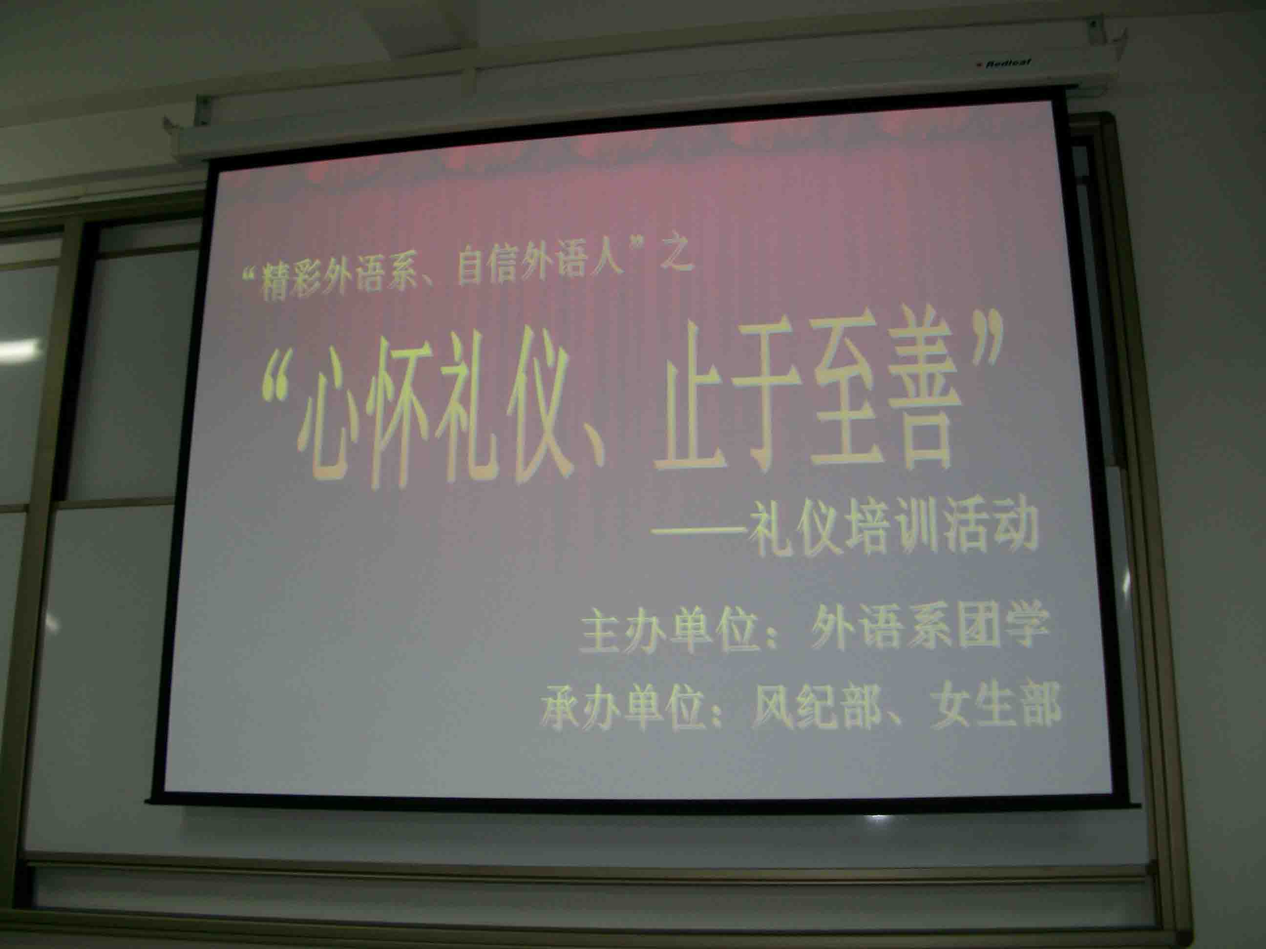 绵绵千年文化,悠悠礼仪之邦。中国素以文明和礼仪传承。2011年3月10日晚18:30,一场别出心裁的礼仪培训在道镕楼 107教室拉开帷幕。外语系团学全体成员在外语系员工会风纪部、女生部的组织下接受了一次旨为“心怀礼仪止于至善”的“礼仪浴”。