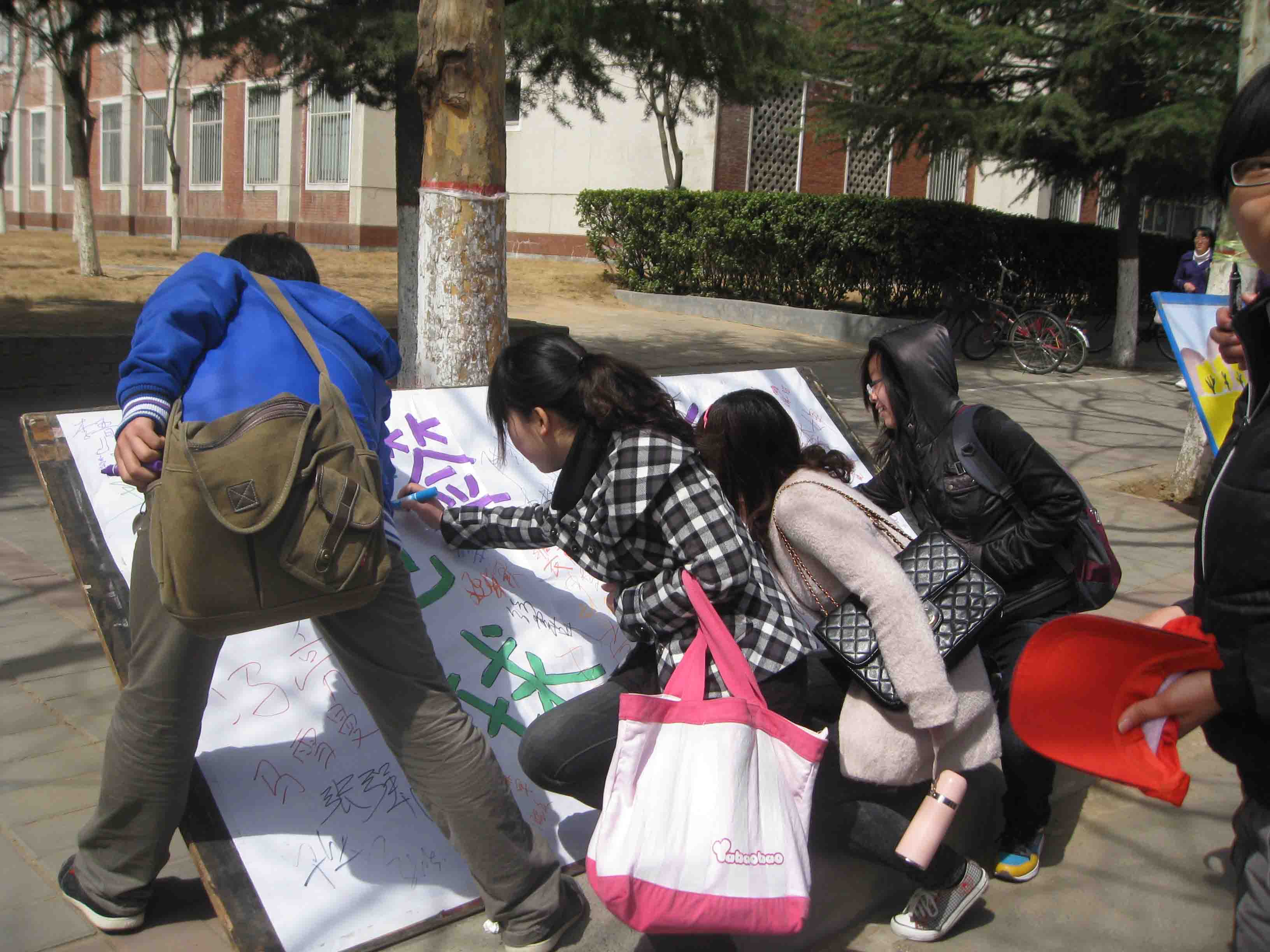 随着下课钟声敲起,员工从教学楼有序而出,竖在树边的两个醒目的签名板引人注目。青志协成员手拿签字笔走向人群,开始向他们介绍“地球一小时”,并邀请他们在签名板上签下自己的名字,加入节能环保行列。在志愿者的耐心讲解下,来往的同学纷纷表示赞同并在板上签下自己的名字,约定一起守护“地球一小时”……金色的阳光下,竖立的两个大很快就写满了同学们的名字,而这些签名不仅仅是笔画,更是一份承诺和责任。