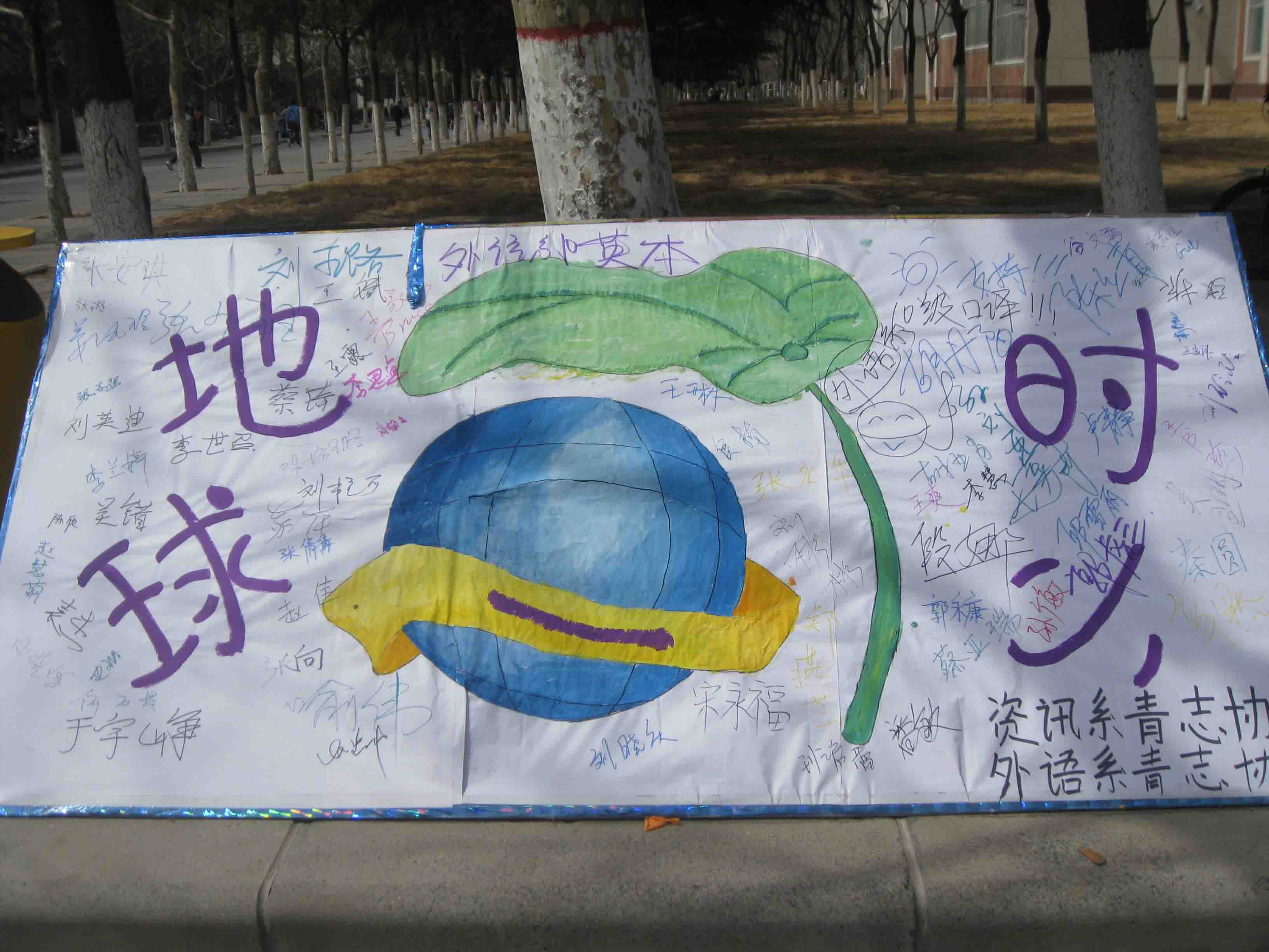 每年3月的最后一个星期六,是“地球一小时”日。在这一天的20:30—21:30,全世界熄灯接力,以此来呼吁低碳环保。3月24日中午,由外语系青志协联合资讯系青志协在龙湖食府举行了“地球一小时”签名活动。