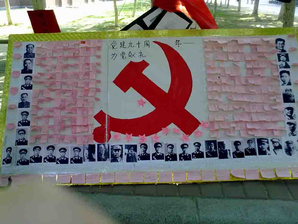 其中图片展、系报、展板、主题班会以传统方式分层次展开宣传,向大家展示了建党九十周年以来党的重大发展。开国元勋展板特列举英雄历史人物,并附有相关介绍,同学们在观看的过程中不仅体会到了革命先辈们浓烈的爱国情谊,并且互相交流个人观点,对党有了进一步的认识。另外,外语系的学子们还通过便利贴表达对党的热爱,传达着对党的祝福。九十年的峥嵘岁月,风雨兼程,坚定执着!
