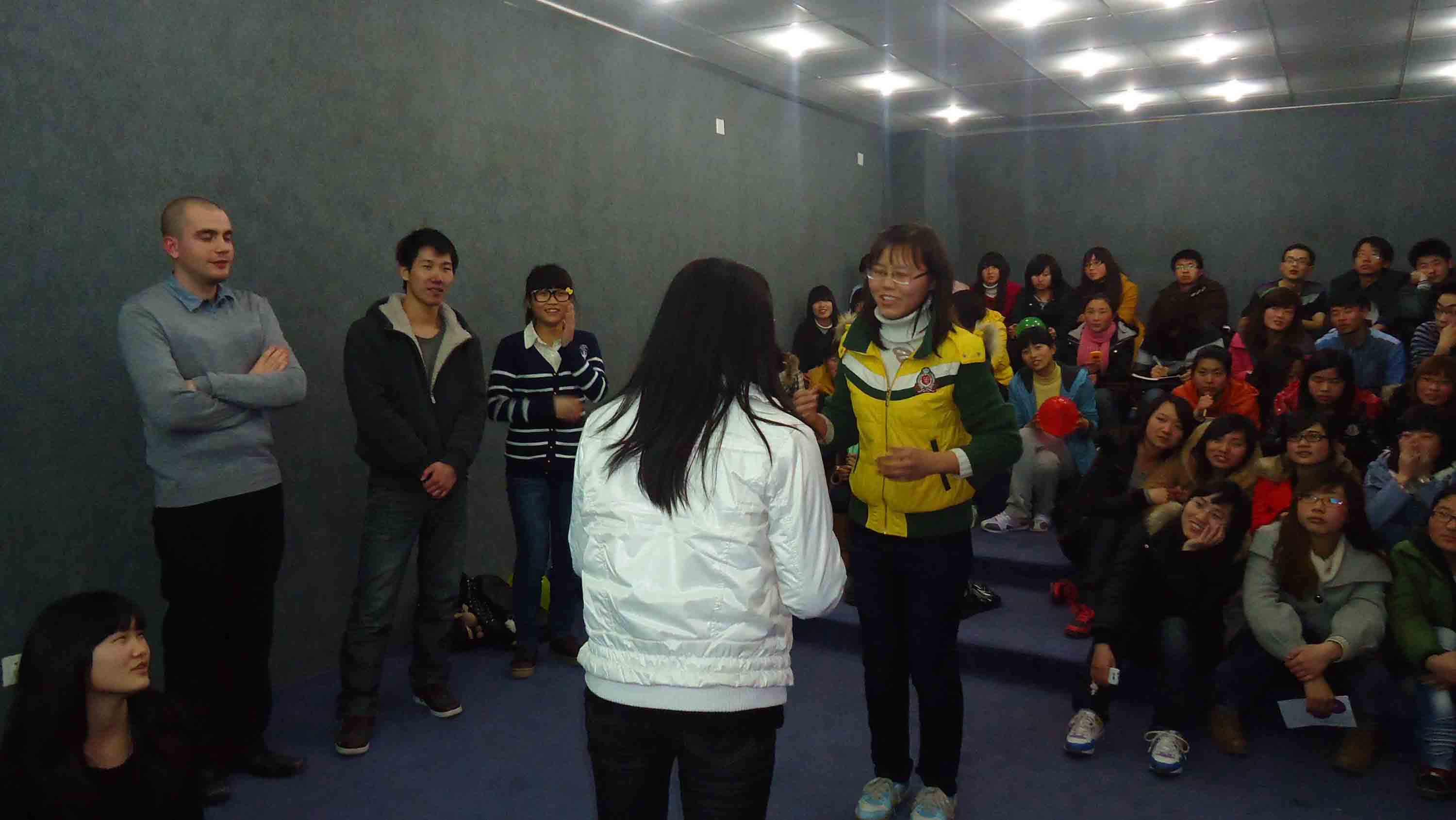 活动在一段激情街舞中正式拉开帷幕。本次活动形式多样,内容丰富。第一环节“YES OR NO ”,由PPT文档播放图片,主持人提问,在场同学通过回答yes or no 的方式猜猜谁是ghost。第二环节猜单词,两人合作,一人释义,一人由此猜出正确单词。第三环节拼故事,大家充分发挥合理想象和语言表达能力,用已给单词讲述一个完整的故事。每个环节,在场同学积极踊跃,自由组合,默契配合,并与外教形成良好的互动,现场气氛十分热烈,使大家在寓教于乐中掌握了更多英语知识,拓宽了知识面。最后,活动在外语交流中心主任田楠与李亚辉英文歌曲的倾情合唱中圆满结束。