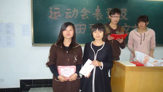 最后,员工会主席王梦娇与体育队部长任士奇向在运动会中获奖的个人及班级代表发发放奖状和荣誉证书并合影留念,会议在一片喜悦气氛中结束。