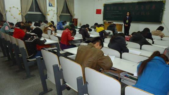 来自不同的专业,不同的班级的300多名同学参加了初试,经过认真准备,紧张激烈的笔试现场,同学们遵守会场纪律,沉着应对。