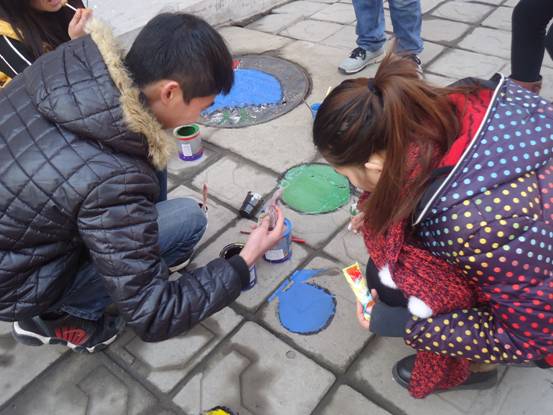 2013年12月14日早上8:30,青志协志愿者团队在部长韩文洁,马路青等的带领下,相聚在升达南区西饼店门口,开始为井盖涂鸦活动做准备。9:00涂鸦活动正式开始。