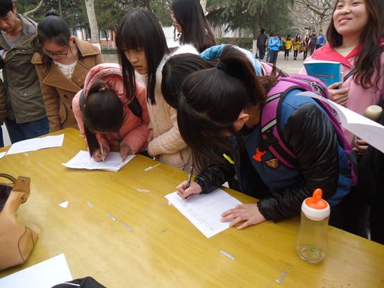 近日,2014年度郑开国际马拉松志愿者升达站的招募活动正式拉开序幕。外语系青年志愿者协会在龙湖食府前举办了郑开国际马拉松志愿者招募的宣传和报名活动,此次活动引发了全校广大师生的关注。