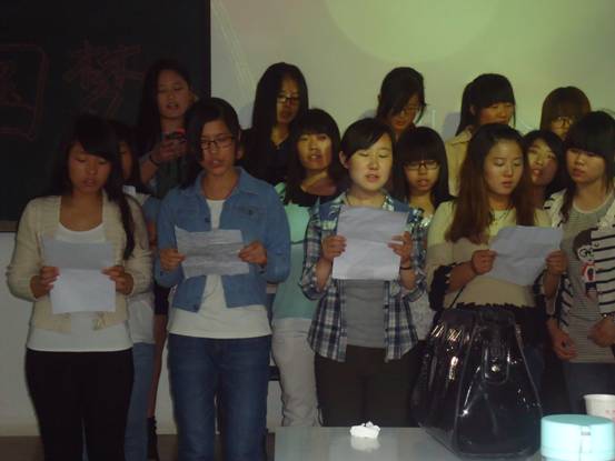 活动伊始由主持人向同学们介绍了“中国梦”的背景并观看了“中国梦”的相关视频,使同学们对“中国梦”有了更好的了解。接下来同学们观看了由口译班拍摄的微电影,向同学们展现老员工活体现老员工的追梦过程。随后分别由英本一班合唱《明天会更好》,英本二班演唱《Theshow》,英本三班表演三句半,商英一班合唱《我们都一样》,日语班个人独唱《风的记忆》,商英二班合唱《最初的梦想》精彩的表演赢得了阵阵掌声。然后,同学们观看视频《梦想show》并由同学们写下自己的梦想,有闵慧敏抽取了六个幸运同学颁发奖品。随后通过有趣的游戏“梦想竞拍”,“心有灵犀”把活动推向高潮。最后,在观看了励志电影种结束活动。
