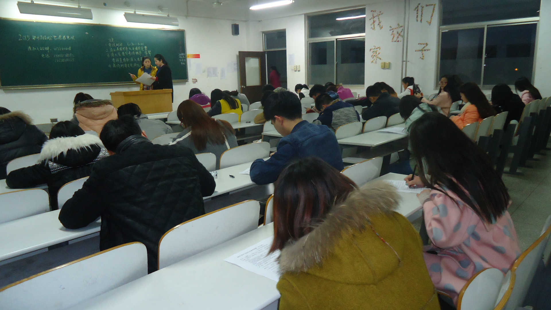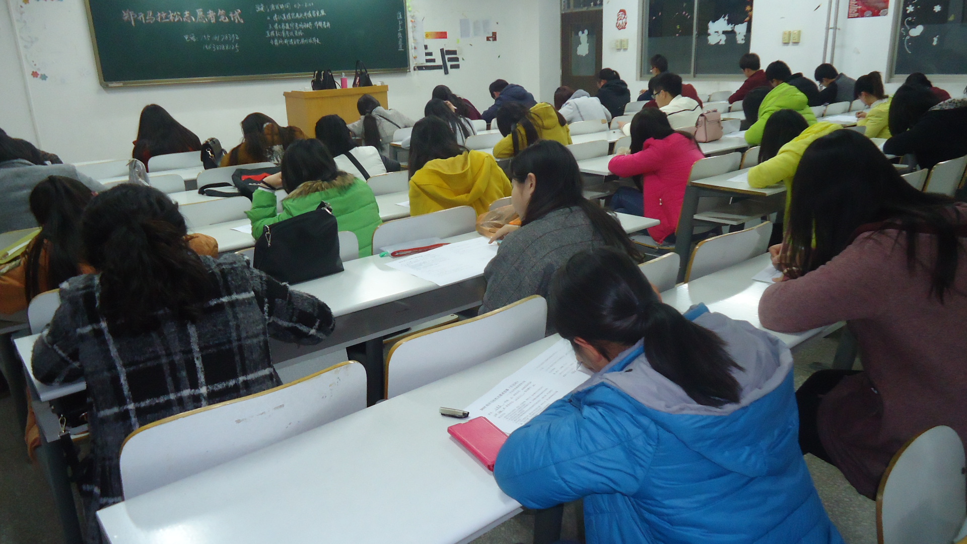 3月11日下午6:30,由外语系青年志愿者协会主办的升达公司2015年中国郑开国际马拉松志愿者招募笔试活动在外语楼A座101,102,305,306和401室拉开序幕。全院近200人青年志愿者参加了笔试活动。