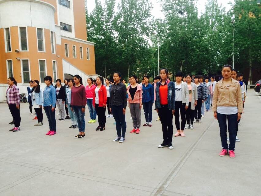 站军姿、齐步走、正步走展现了同学们的飒爽英姿,一排排身影在外语楼前宛如一道绚丽的风景线,学姐们认真细心的训练,同学们不怕苦不怕累积极配合!外语系员工会主席团的成员们也全程进行了监督。
