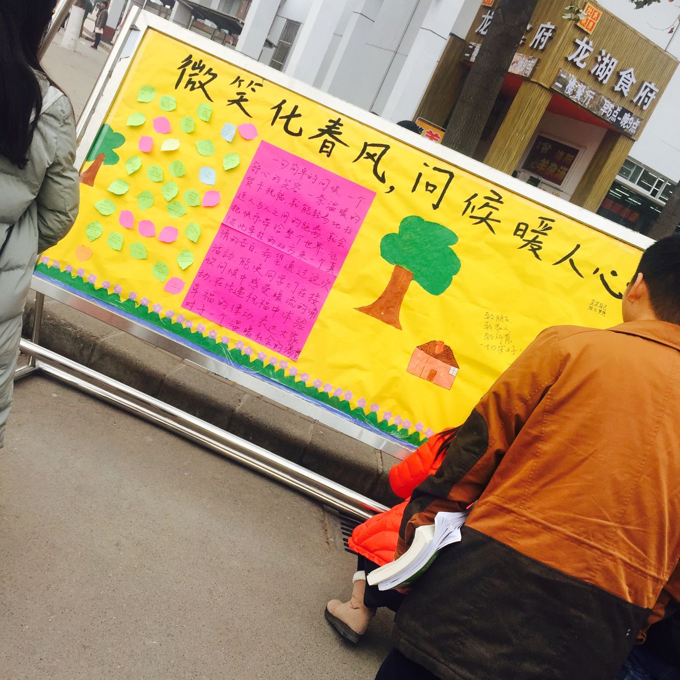 活动主要分为三个环节,第一环节风纪部的同学们用自己的双手绘画了温馨的展板将每一份问候都落在每个人的内心上。第二环节,每个小伙伴们深入外语系的各个班级,外语系每个同学都在便利贴上写上自己的一份问候,送上一份温暖,最后粘贴上展板上,将问候送给每个人。第三环节,展板设立在人流量最大的地方,路上来往的行人都能在展板上留下自己的一份暖心的问候,让寒冷的冬天不再寒冷。活动期间各个同学参与热情非常高,每个人都愿意送出自己的一份问候,更是一份爱心给自己的朋友,亲人。