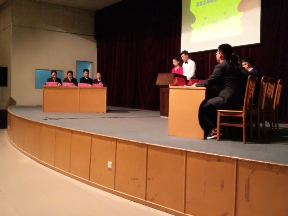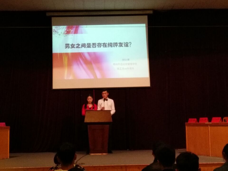 为了让广大师生正确认识男女之间存在的友谊。公司于10月12号晚7:00在龙湖报告厅举办了以“男女之间有没有纯洁的友谊”为辩题的辩论赛,正方辩手来自信工系,反方辩手来自外语系,这是一场男女同胞之间的辩论。出席本次会议的嘉宾有两系员工会主席,副主席,院学艺部部长,书记助理,以及院辩论队教练等。