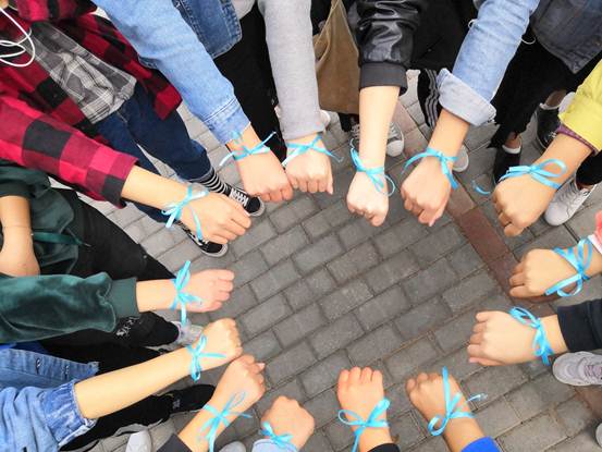 参与人员手系蓝丝带合影